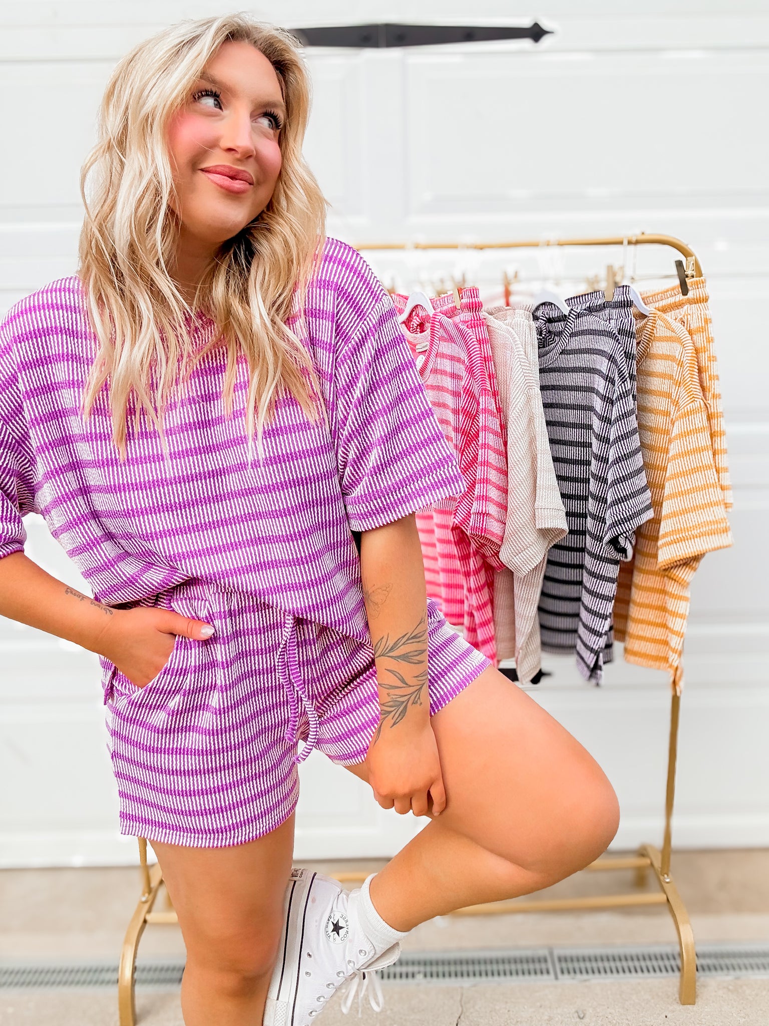 The Travel Plans Set features a soft, ribbed knit top paired with matching drawstring shorts for an easy, relaxed fit. The playful stripe pattern adds a fun pop of color while keeping things casual and chic. Designed to move with you, this set blends comfort with boutique-worthy style you’ll reach for again and again.