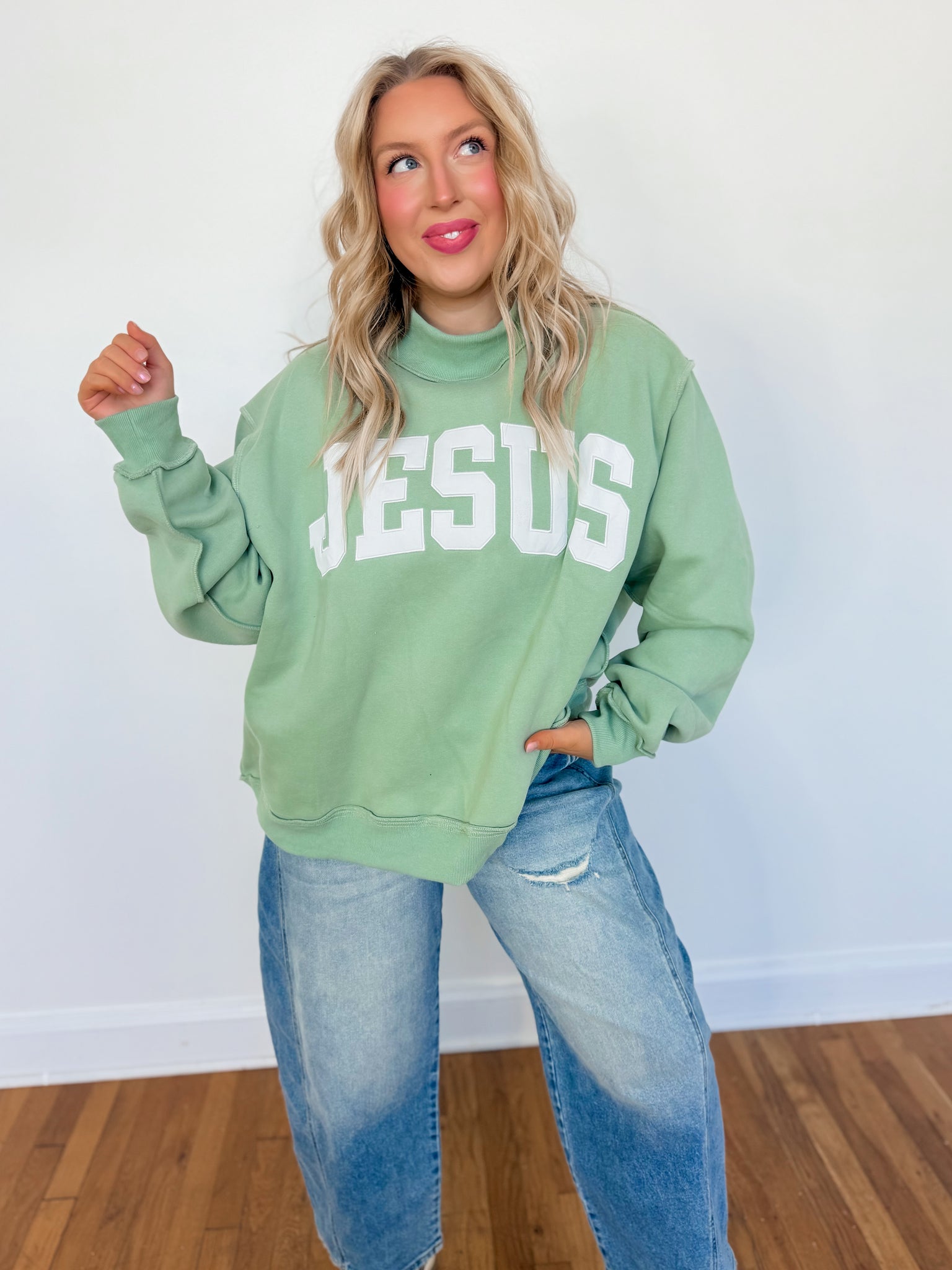 This pullover features a boxy, oversized silhouette with a cozy mock neckline for a modern, relaxed feel. Crafted in a bold sage hue, it’s accented with ivory embroidered “Jesus” lettering for a clean, elevated finish. The soft fabrication and roomy fit make it an easy go-to for everyday wear.