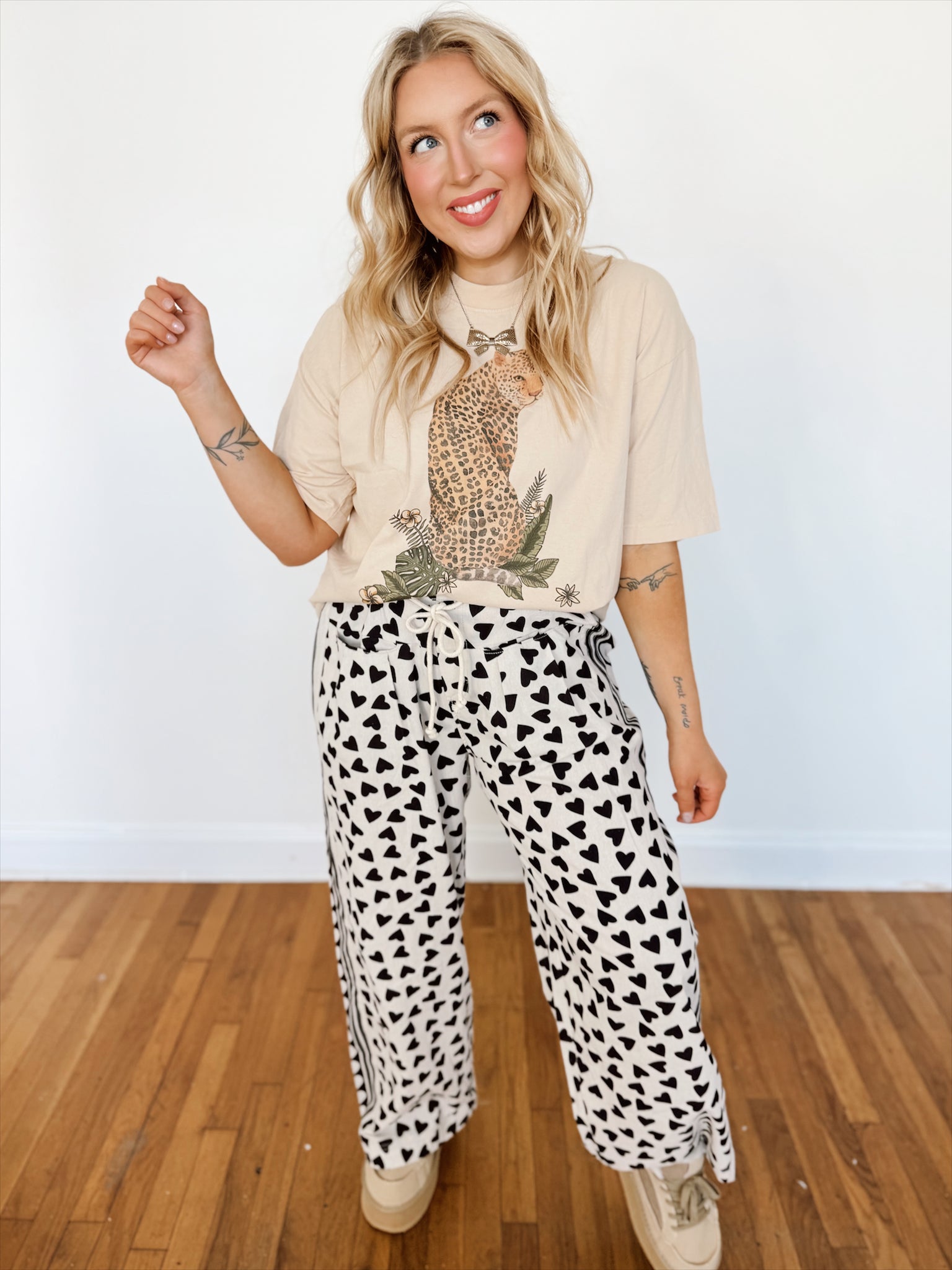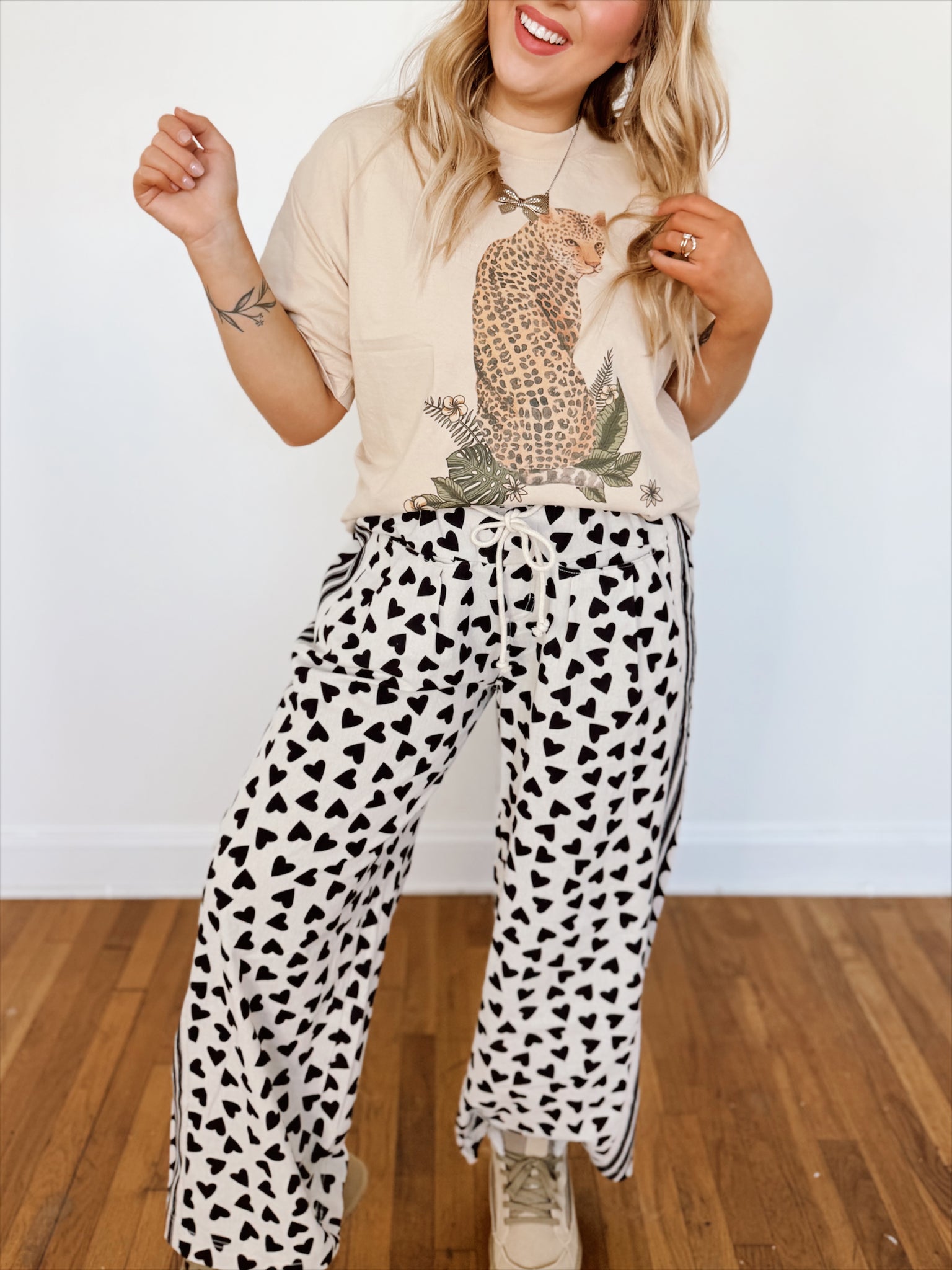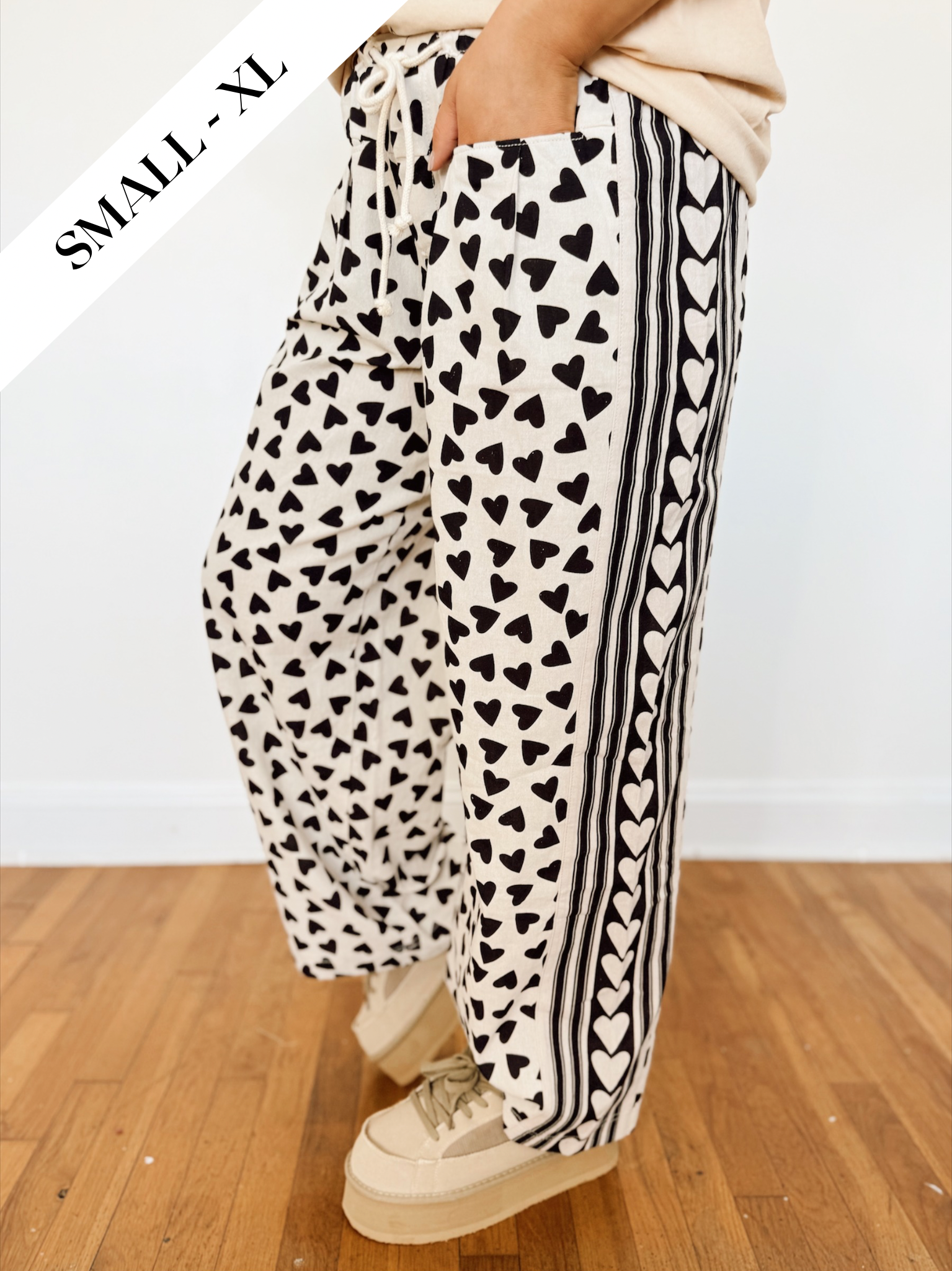 Soft, lightweight lounge pants featuring an allover red heart print on a creamy white base. Designed with a comfortable elastic waistband, adjustable drawstring tie, and a relaxed wide-leg fit. Finished with side/front pockets for an effortless, cozy feel.