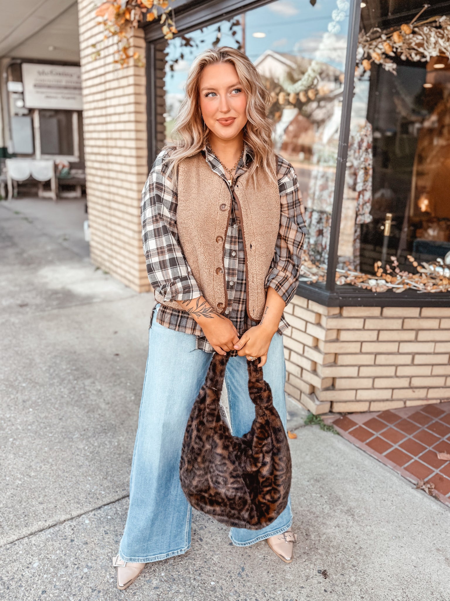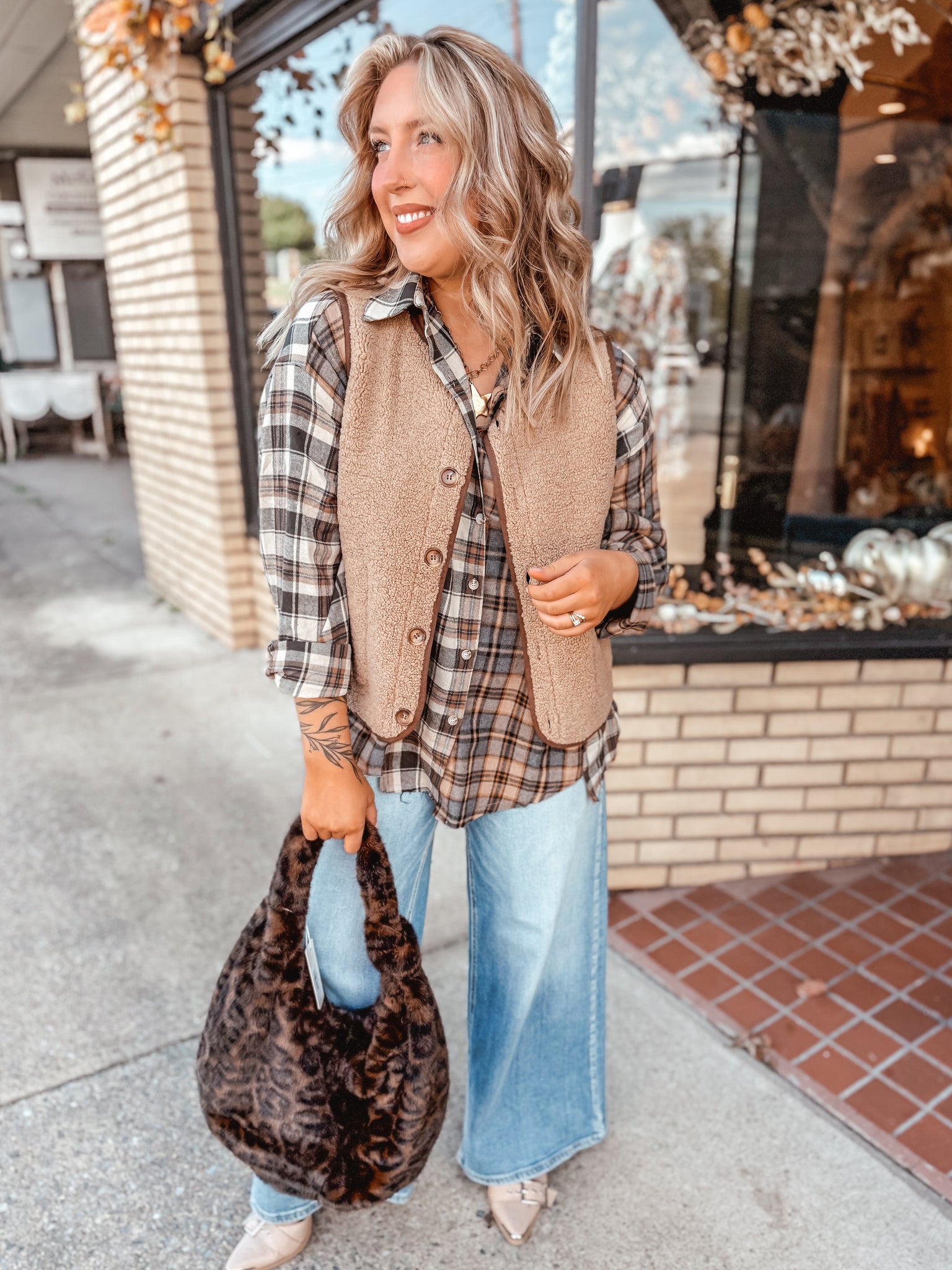 This reversible vest is a true two for one piece! One side features a teddy brown Sherpa side with brown trimming and functional buttons, and the other side features a brown/ivory/gray checkered plaid with pockets and brown trimming.