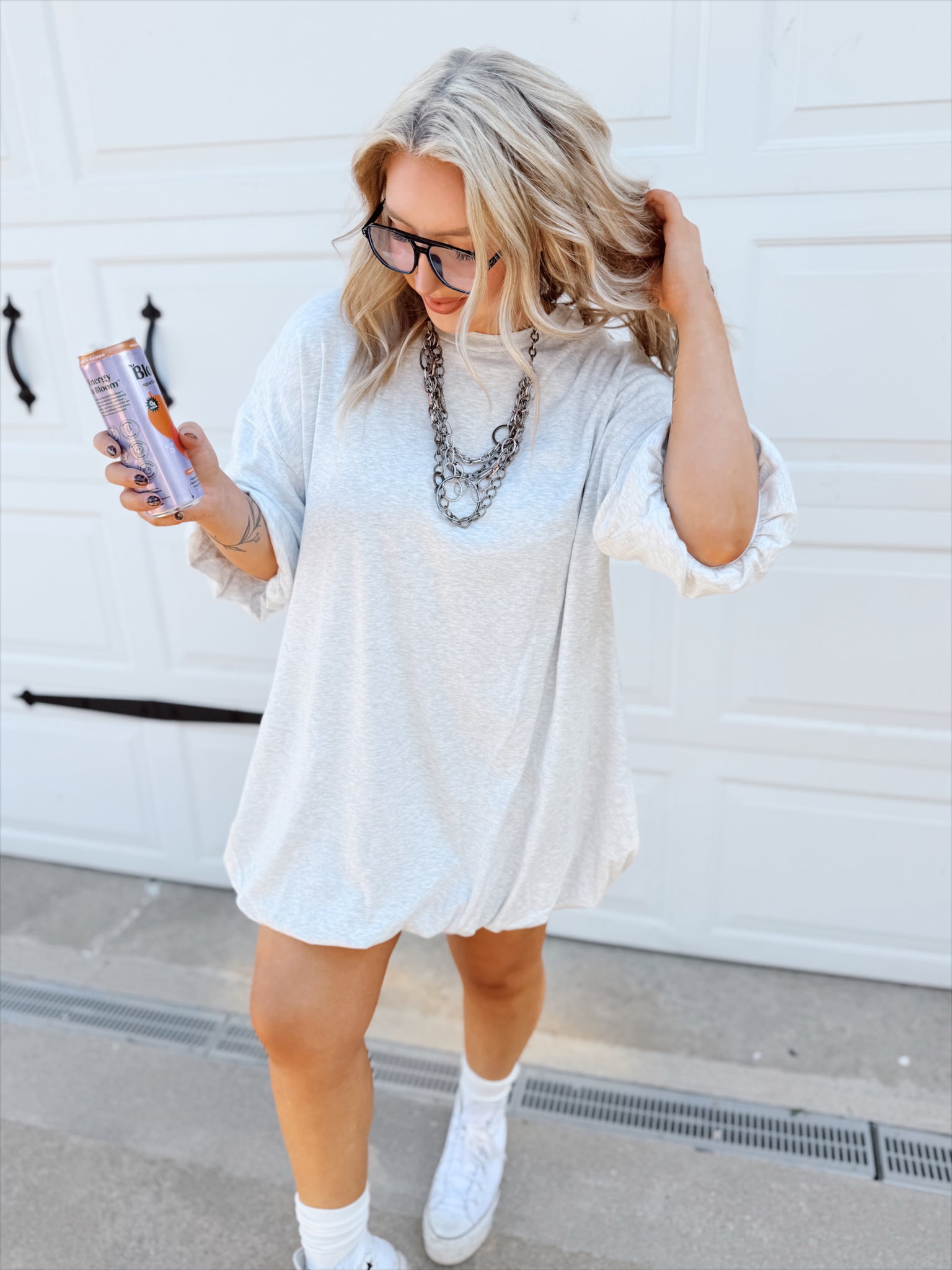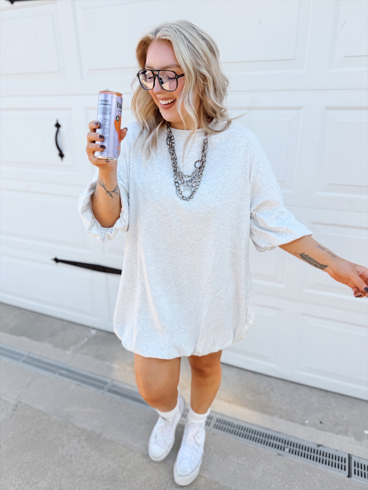 Puff sleeve relaxed bubble hem mini dress. Adorable by itself or paired with biker shorts or leggings as a tunic top!