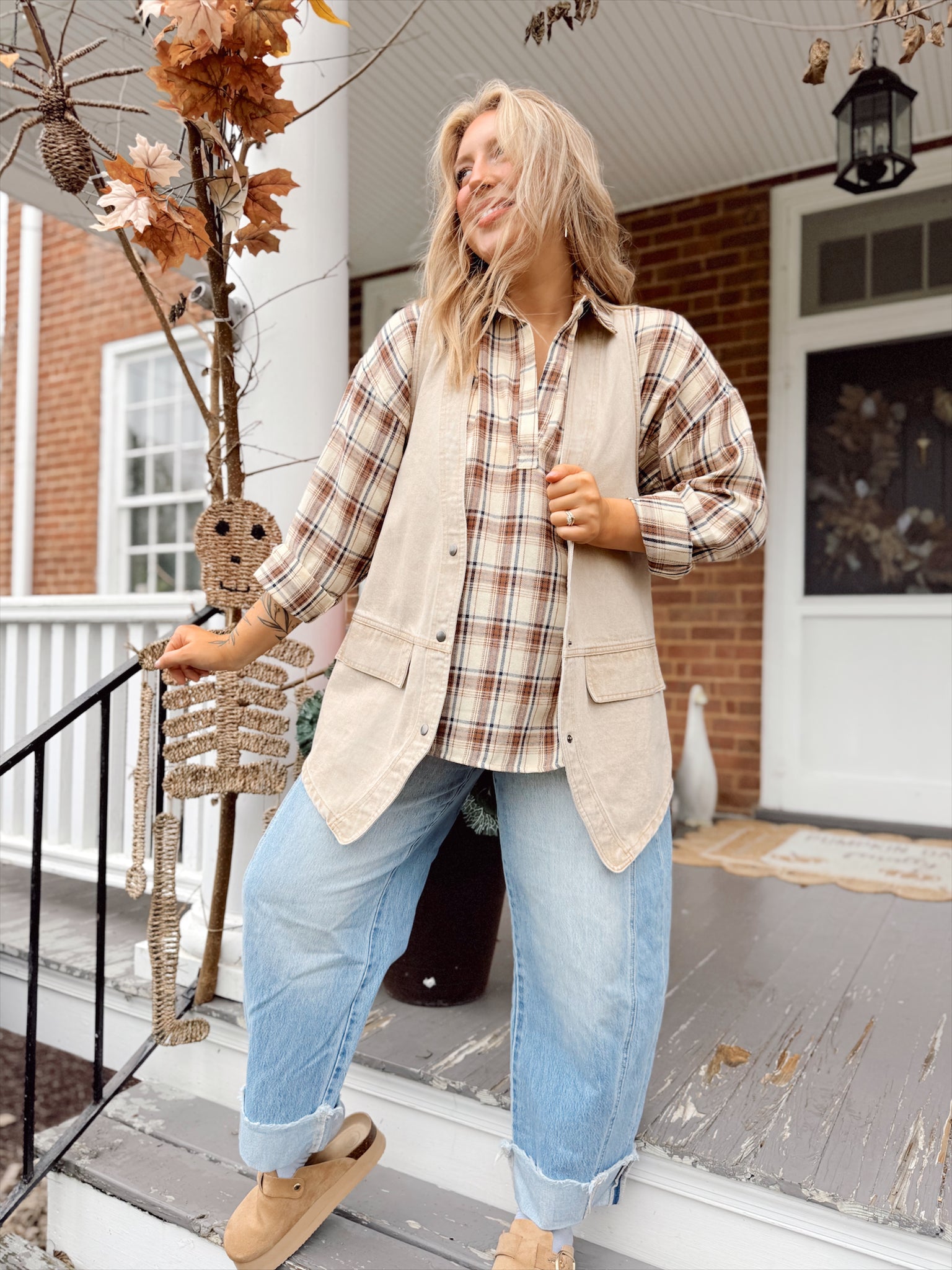 Long length sleeveless denim cargo vest with a straight longline silhouette and front button closure. Features a plunge v-neckline and faux front pockets.