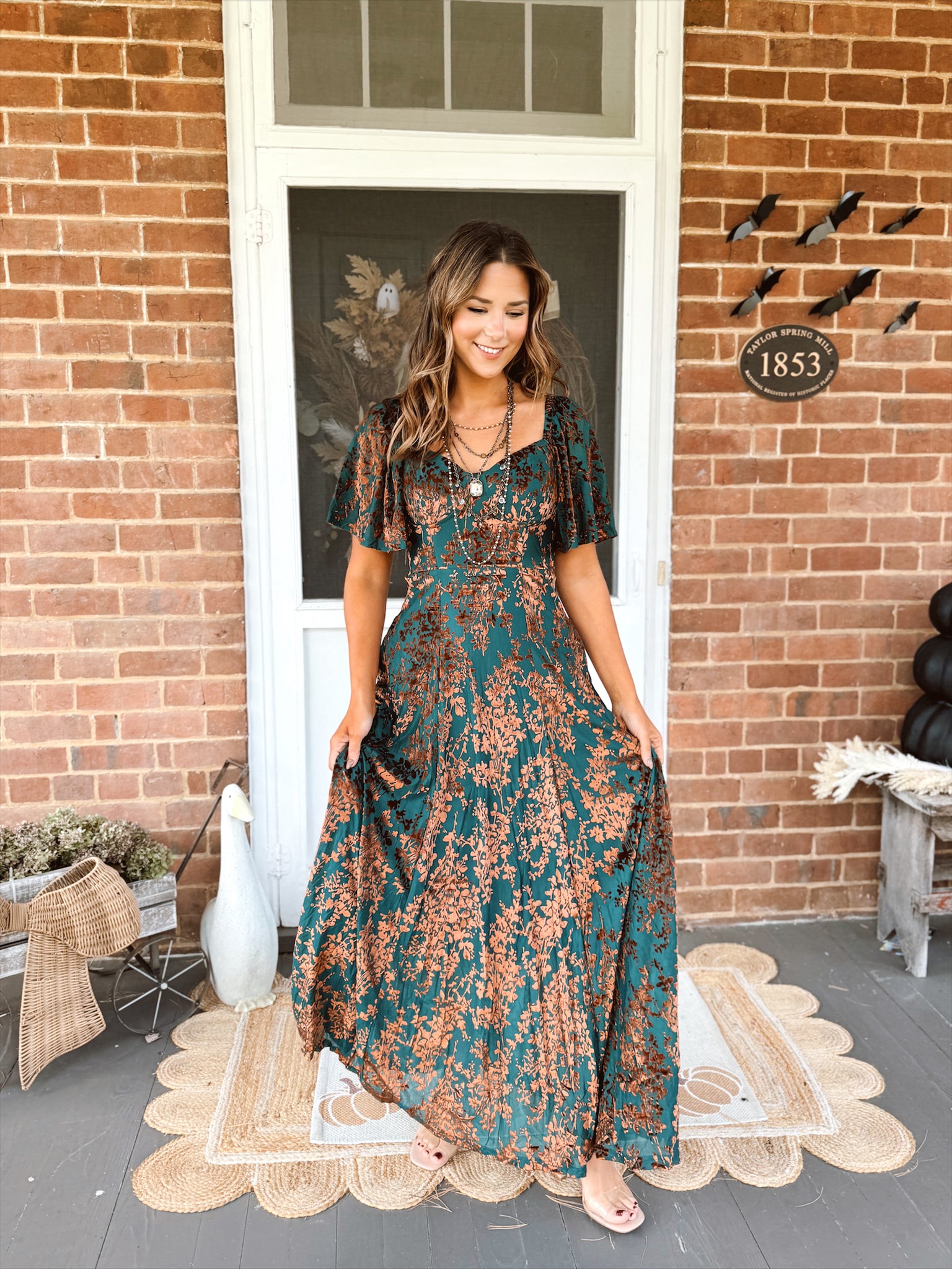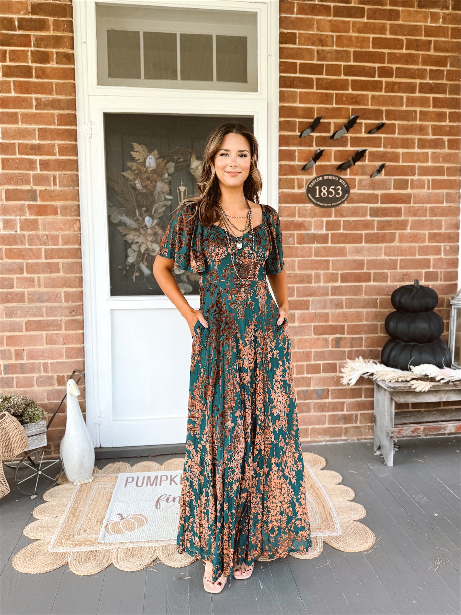 Burnout velvet detail maxi dress with a sweetheart neckline, flutter sleeves, side pockets, and a partially smocked back bodice. Features a full lining and hidden side zipper.