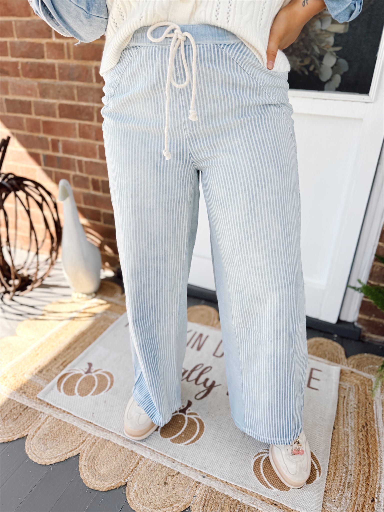 Mineral washed striped Wideleg pants with a drawstring waistband. 90% Cotton 10% Polyester