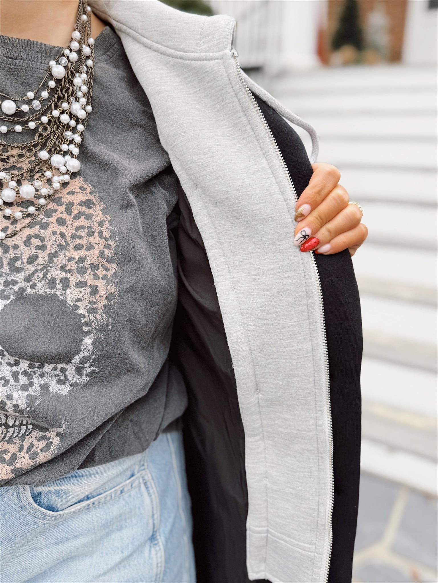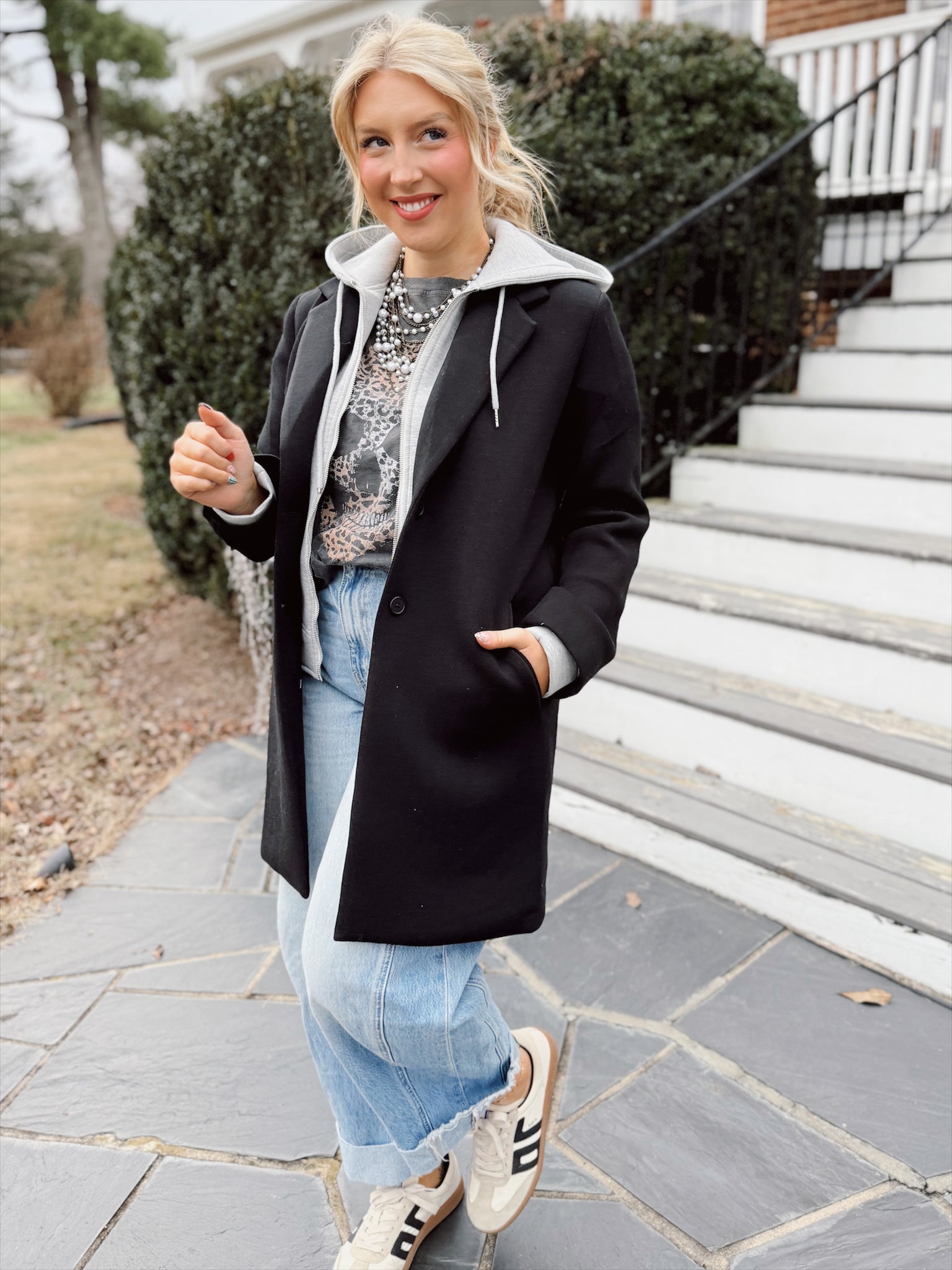 This modern layered-look jacket gives you the best of both worlds—polished and casual in one effortless piece. Designed with a sleek black outer scuba layer and an attached gray hooded insert, it creates the look of a blazer styled over a hoodie without the bulk. Featuring a tailored fit, functional pockets, and a comfortable stretch feel, this jacket is perfect for elevating everyday outfits while staying cozy. Easy to dress up or down for work, errands, or weekend wear.