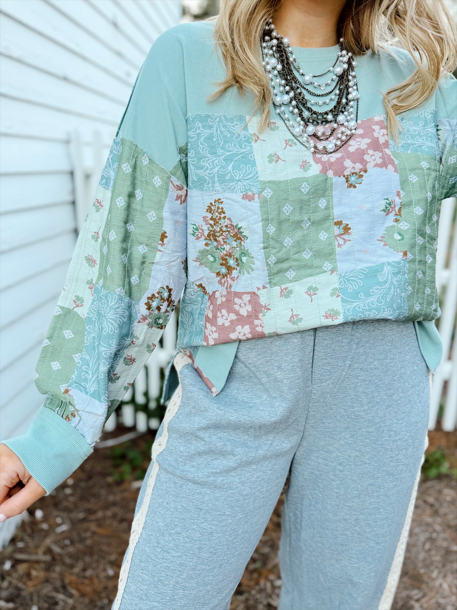 Quilted fabric pull over long sleeve French terry top.