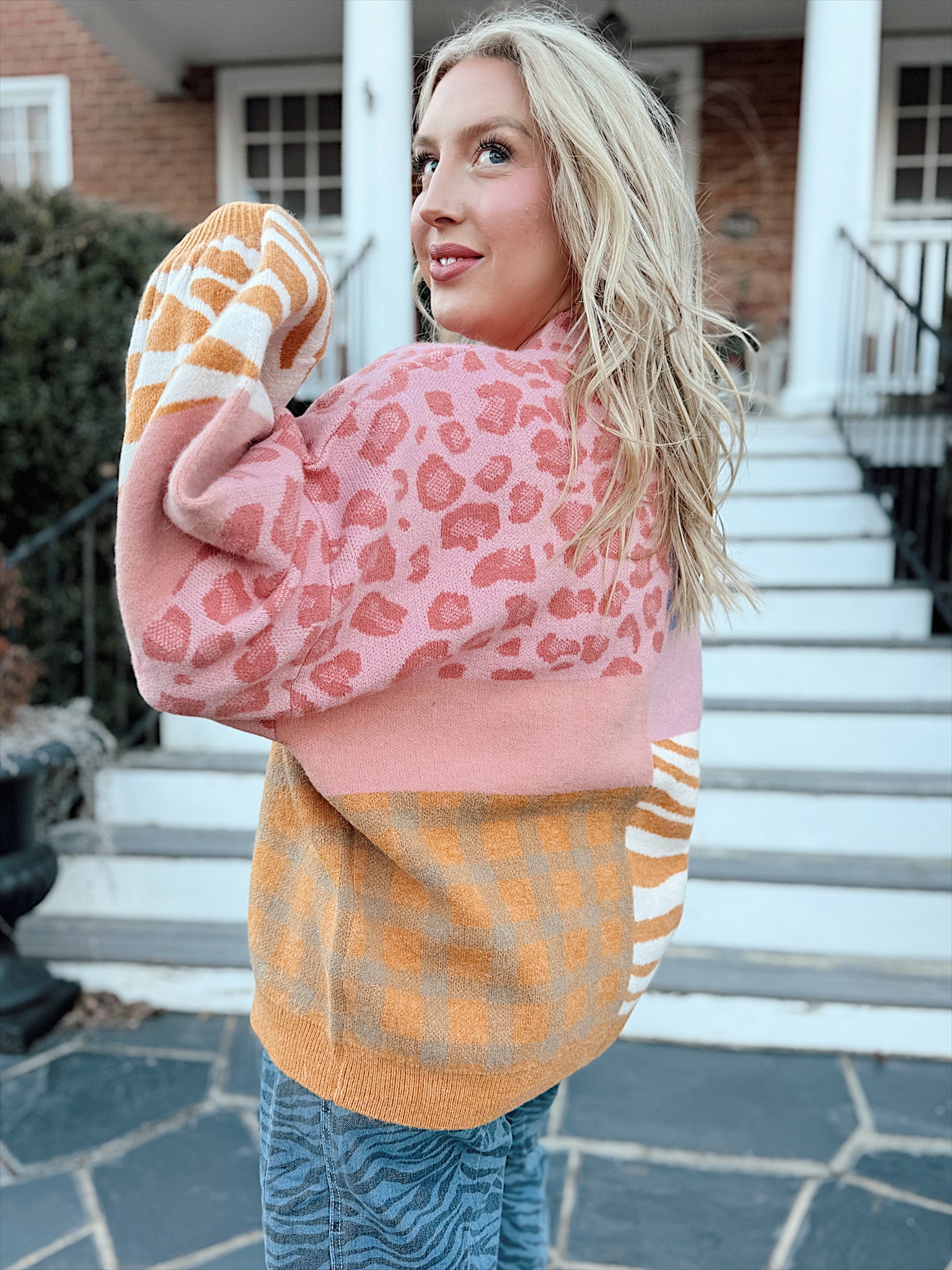 Multi colored checkered and animal print open cardigan. This fun piece is perfect to stay cozy and colorful in!