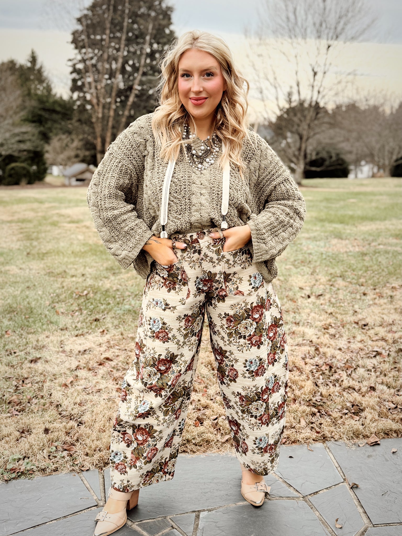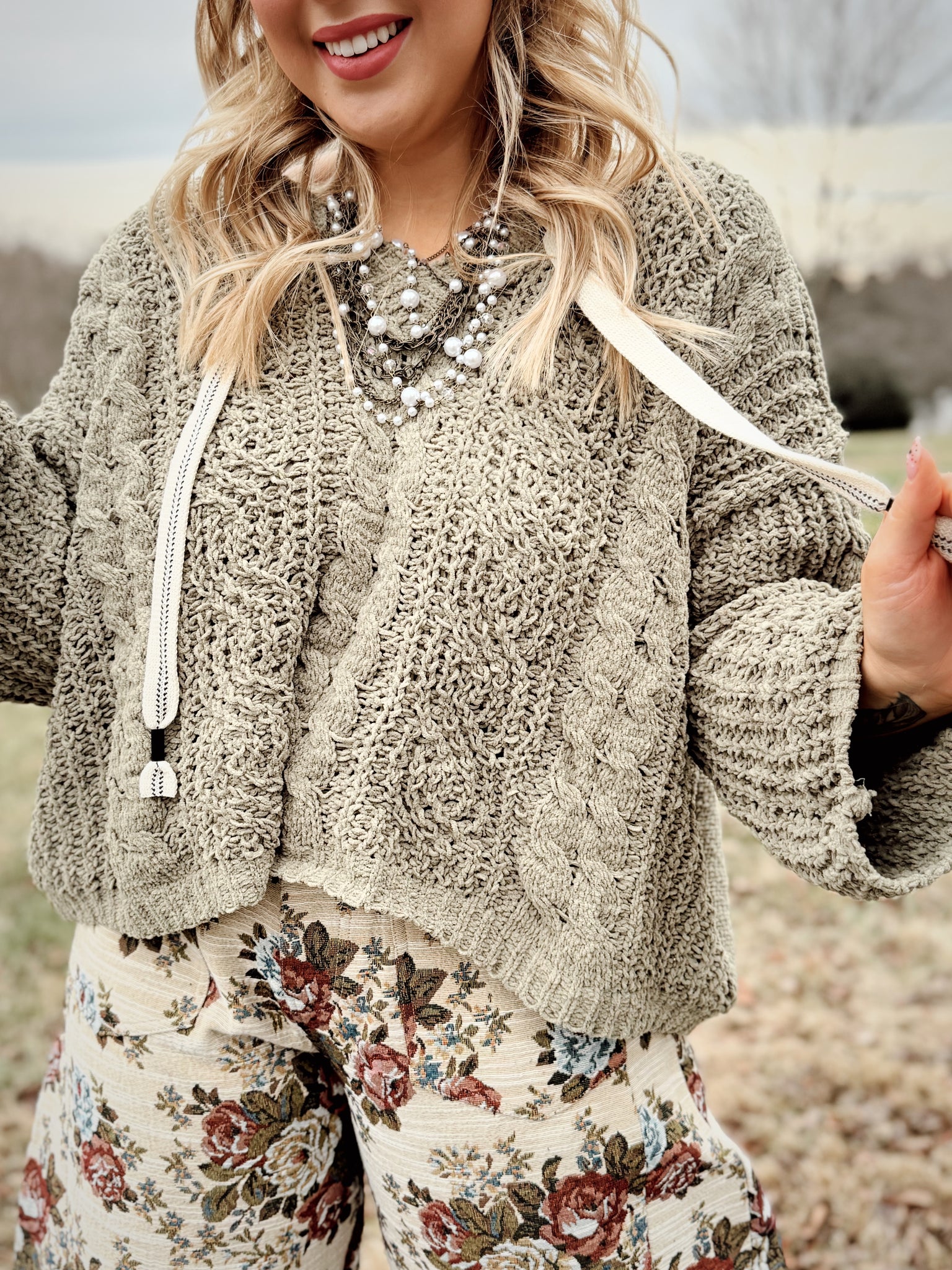 Oversized fit v-neck hooded cable knit chenille sweater.