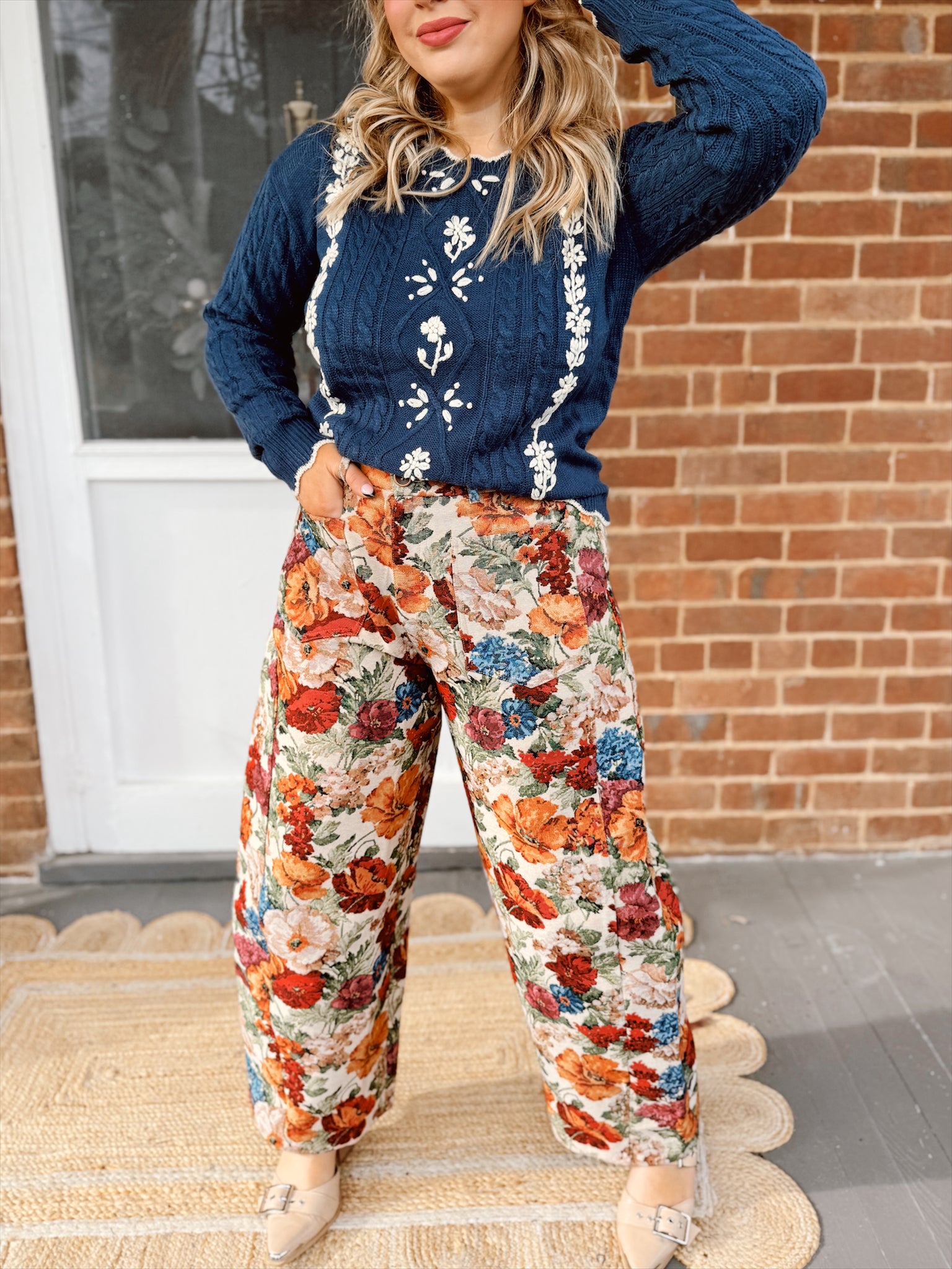 Bright and bold floral tapestry barrel jeans. Featuring a very oversized and true barrel fit. High waisted with front pockets and full length. We suggest ordering the to size. Size guide: