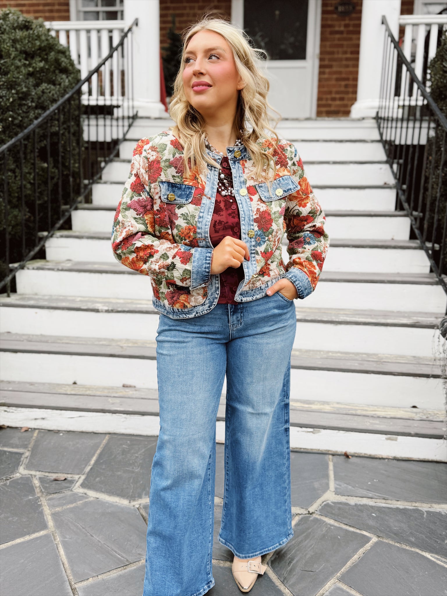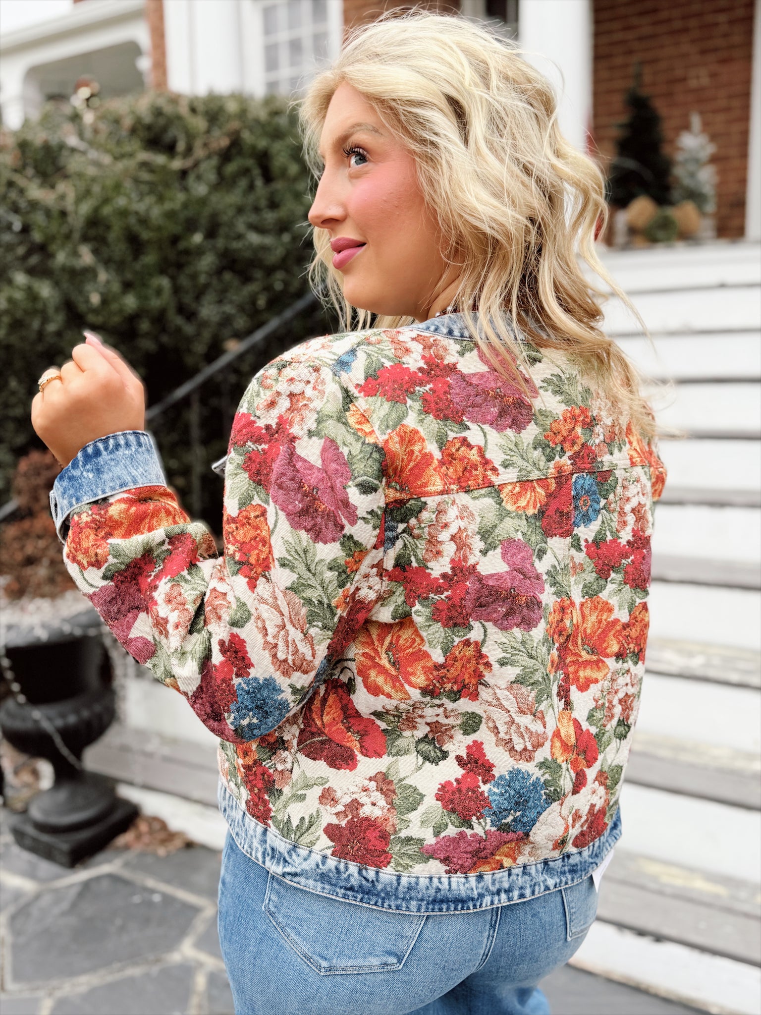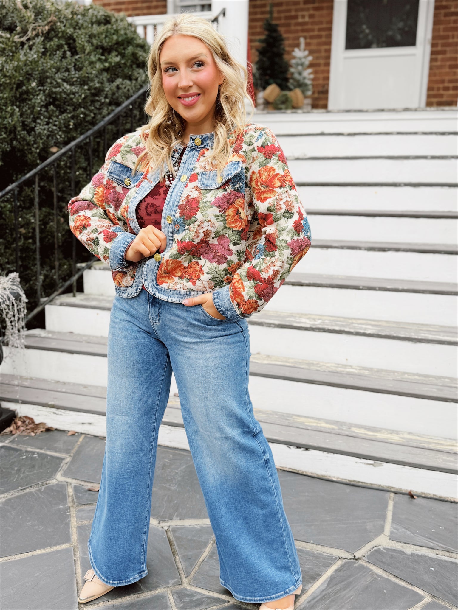 This statement jacket blends vintage charm with everyday wearability. Featuring a richly textured floral tapestry body paired with classic denim trim, it’s finished with gold-tone buttons, chest flap pockets, and a structured yet flattering fit. The cropped length makes it perfect for layering over dresses or pairing with your favorite jeans. A standout piece that adds color, texture, and effortless style to any outfit.