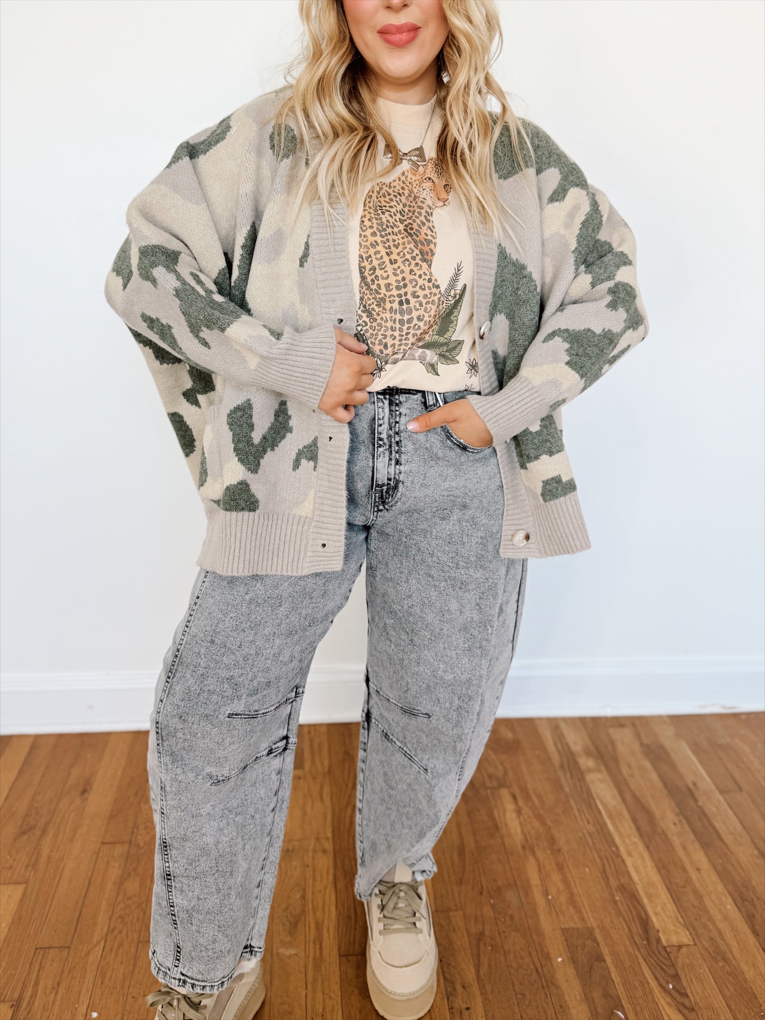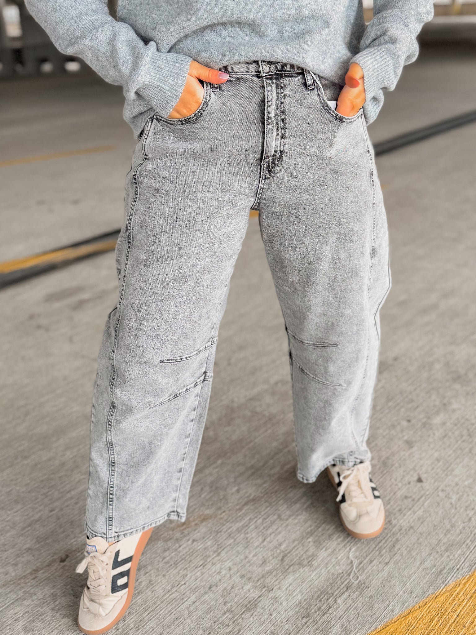 Step up your denim game with these mid-waisted barrel jeans in a striking acid-washed gray. Designed with a wide barrel leg and a non-distressed finish, they give a modern yet timeless silhouette that’s effortlessly chic.