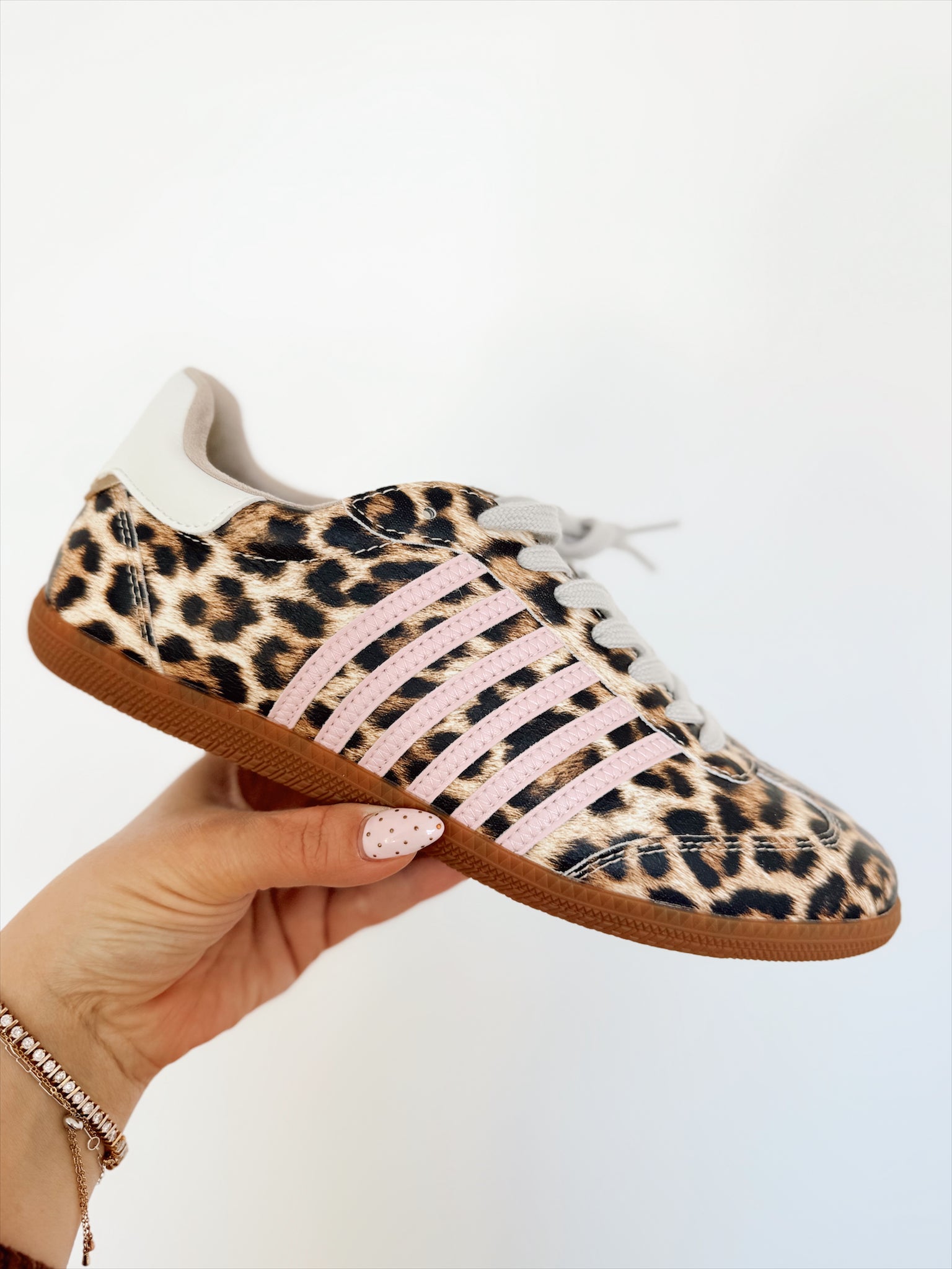 This leopard-print sneaker is accented with soft pink side stripes, creamy trim, and a classic gum sole for a fun yet wearable statement. Designed with a low-profile silhouette, they’re perfect for adding a pop of personality to casual looks.