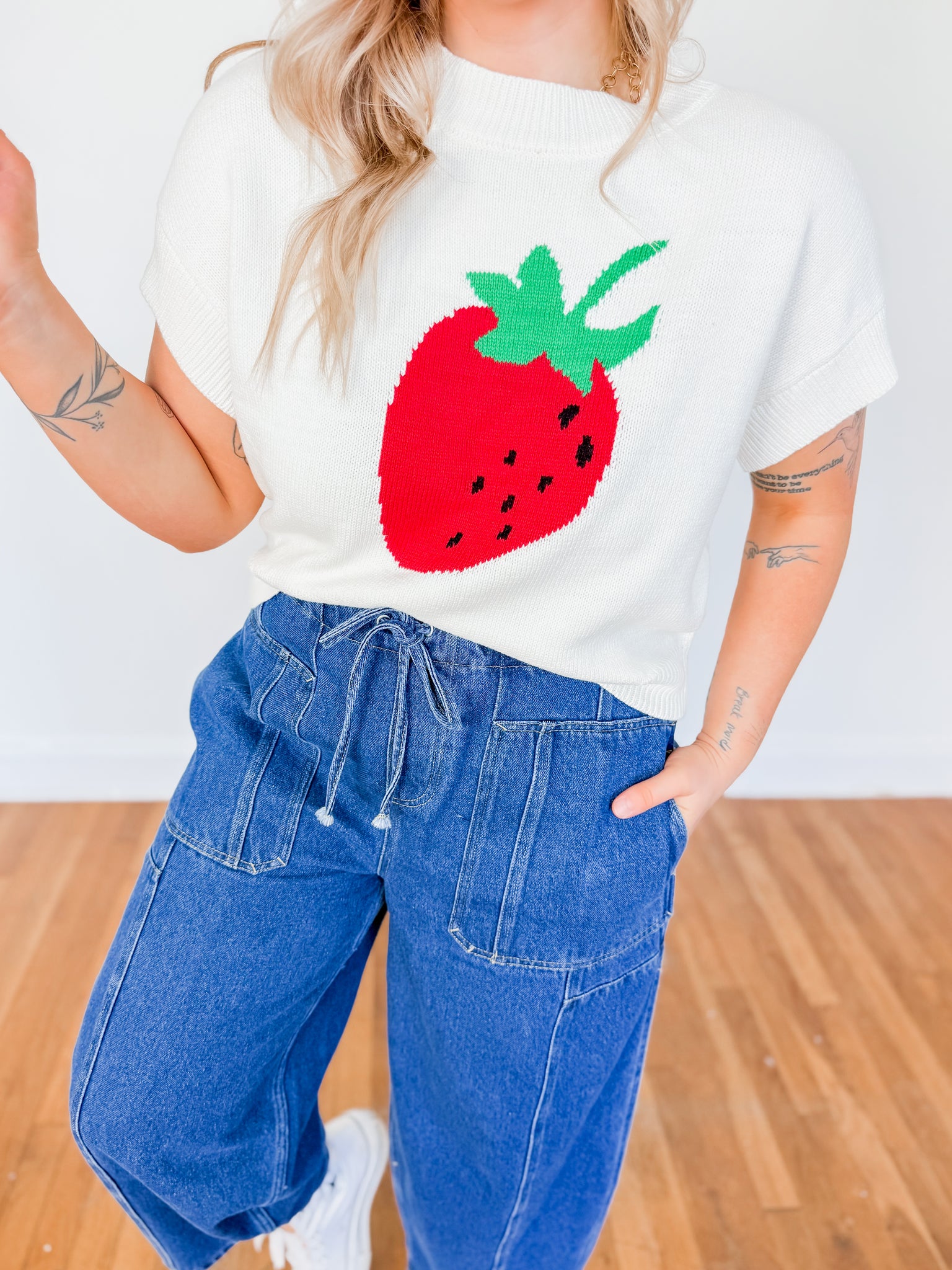 Playful and eye-catching, this adorable knit sweater tee adds the sweetest pop of color to any outfit. Featuring a soft neutral base with a bold strawberry graphic front and center, this top blends cozy knit texture with a fun, whimsical design. The slightly cropped silhouette pairs perfectly with high-waisted denim or trousers, making it an easy statement piece for casual days. Lightweight yet cozy, it’s perfect for transitioning between seasons.