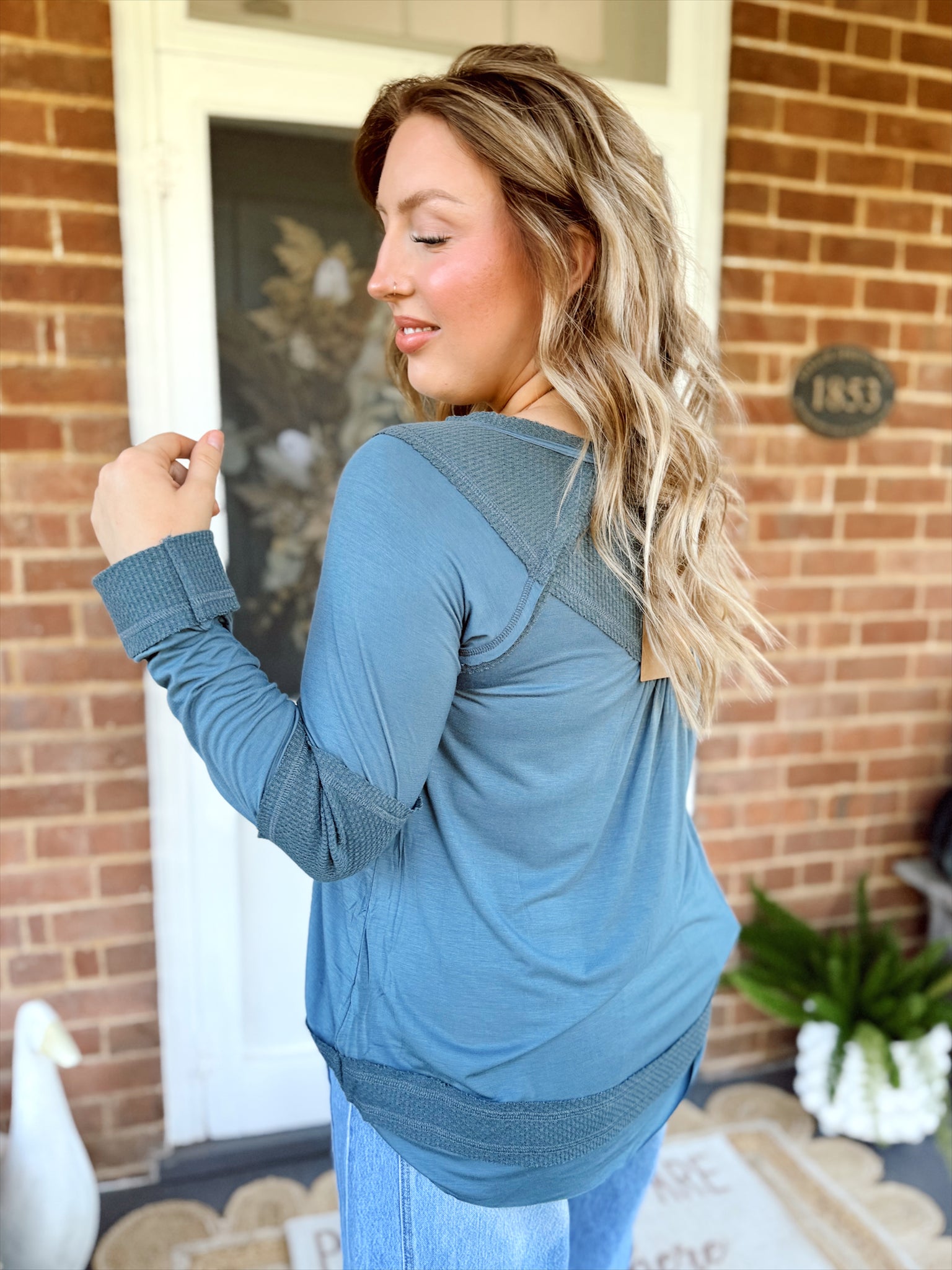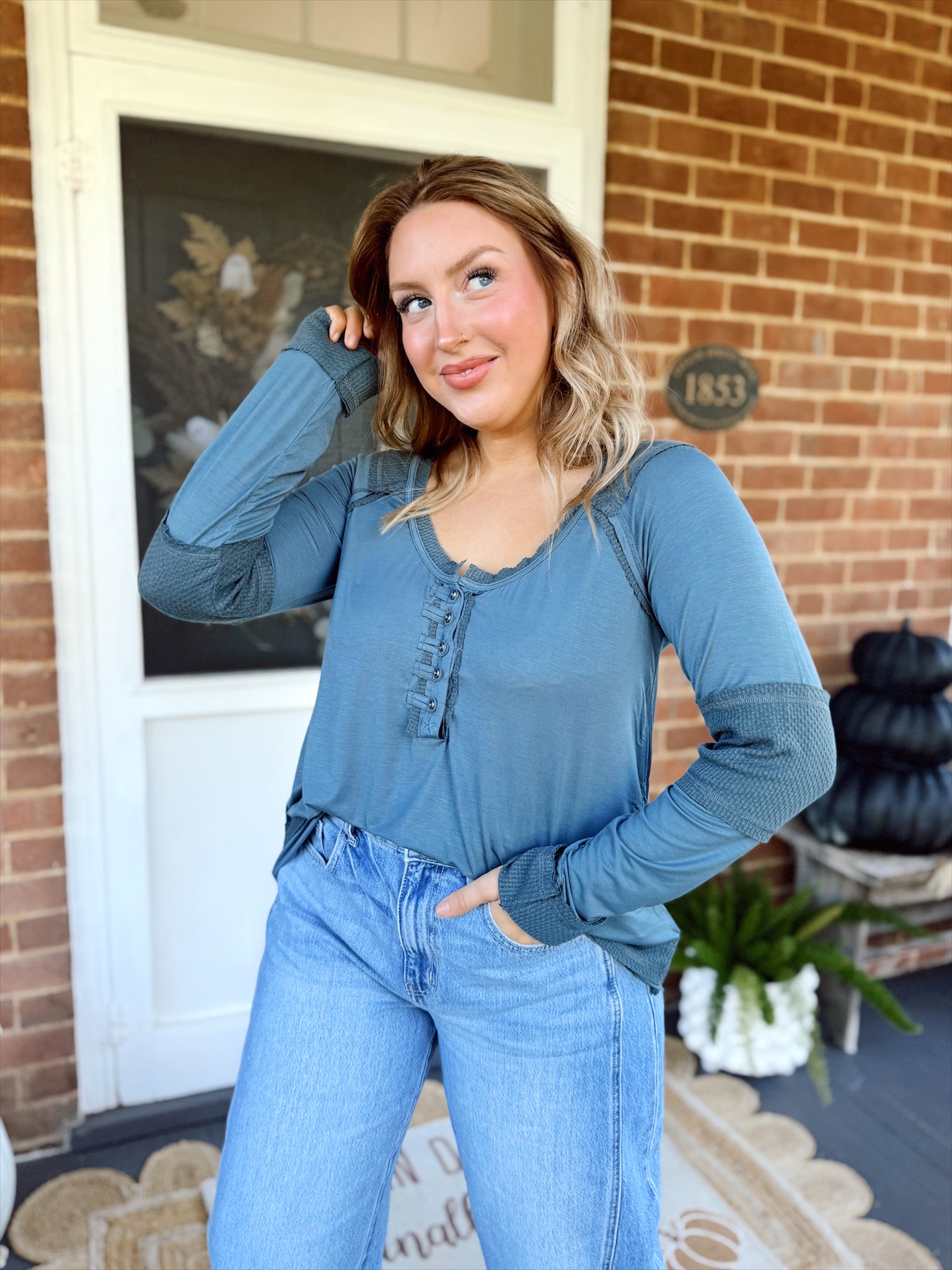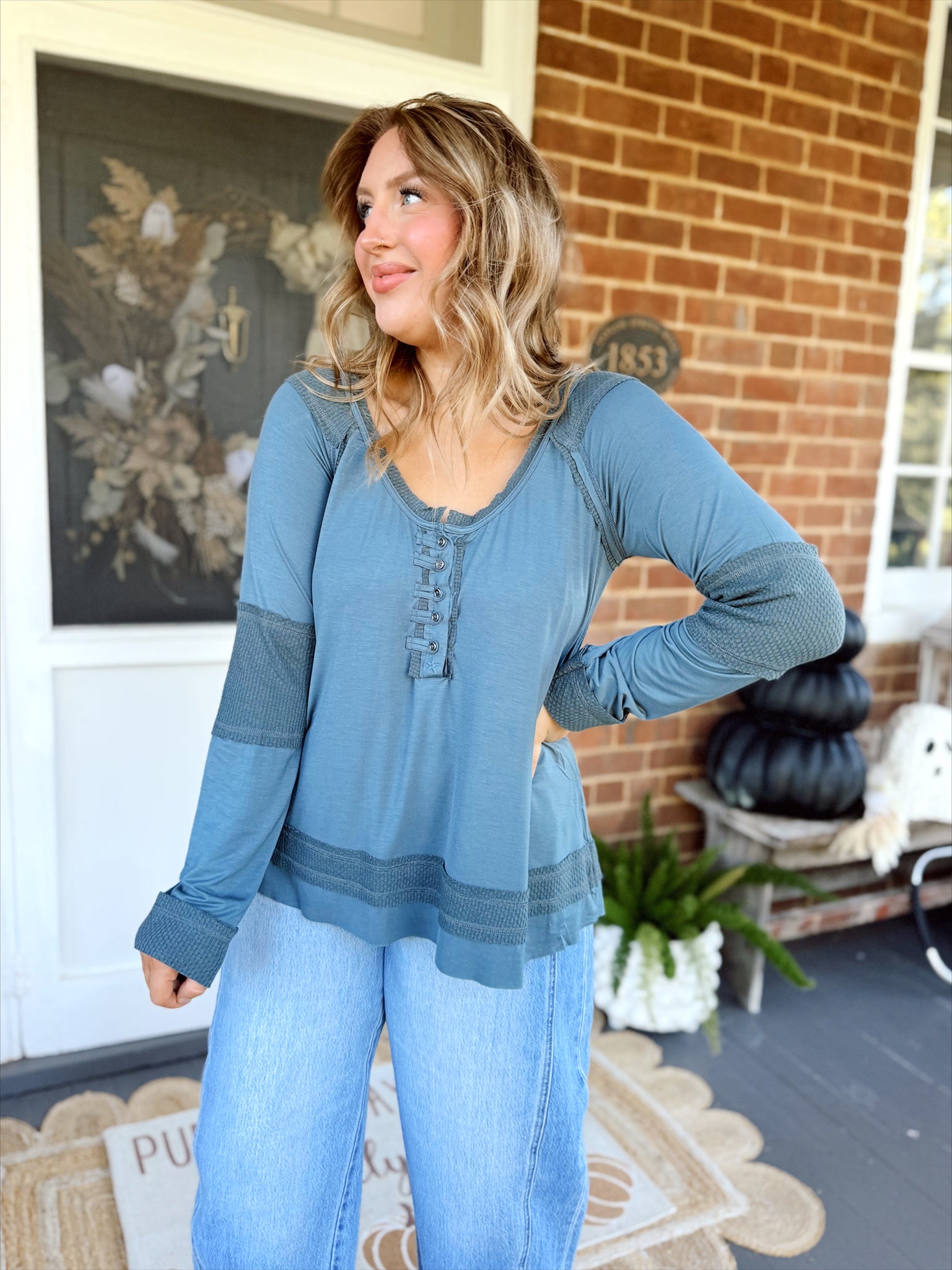 Roomy relaxed fit thermal knit top. Featuring long sleeves and functional top buttons with a scoop neckline. Lightweight + breathable loose fit.