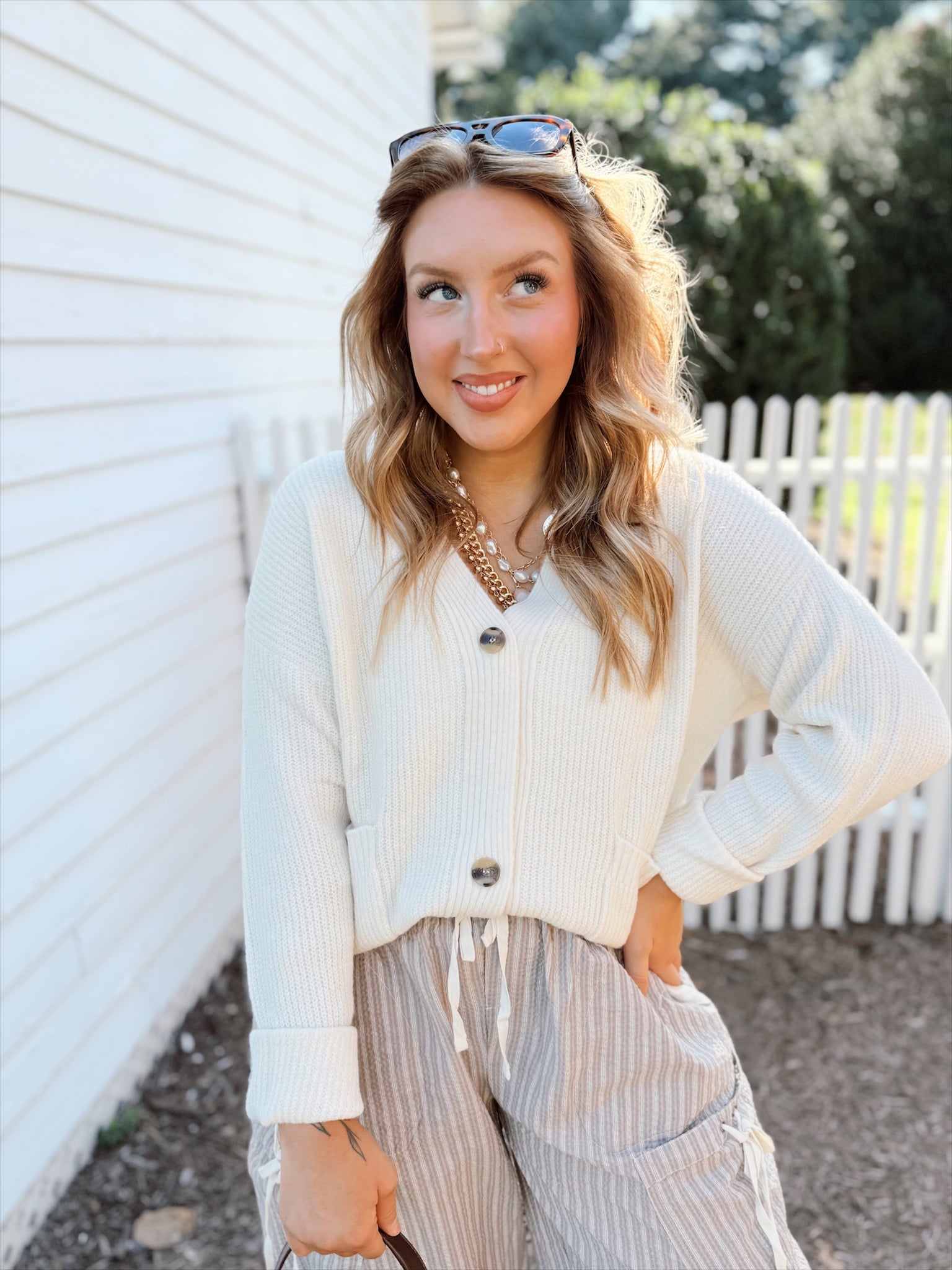 Long sleeve cardigan with functional buttons, front pockets, and v-neckline. Super cute buttoned or open for layering!