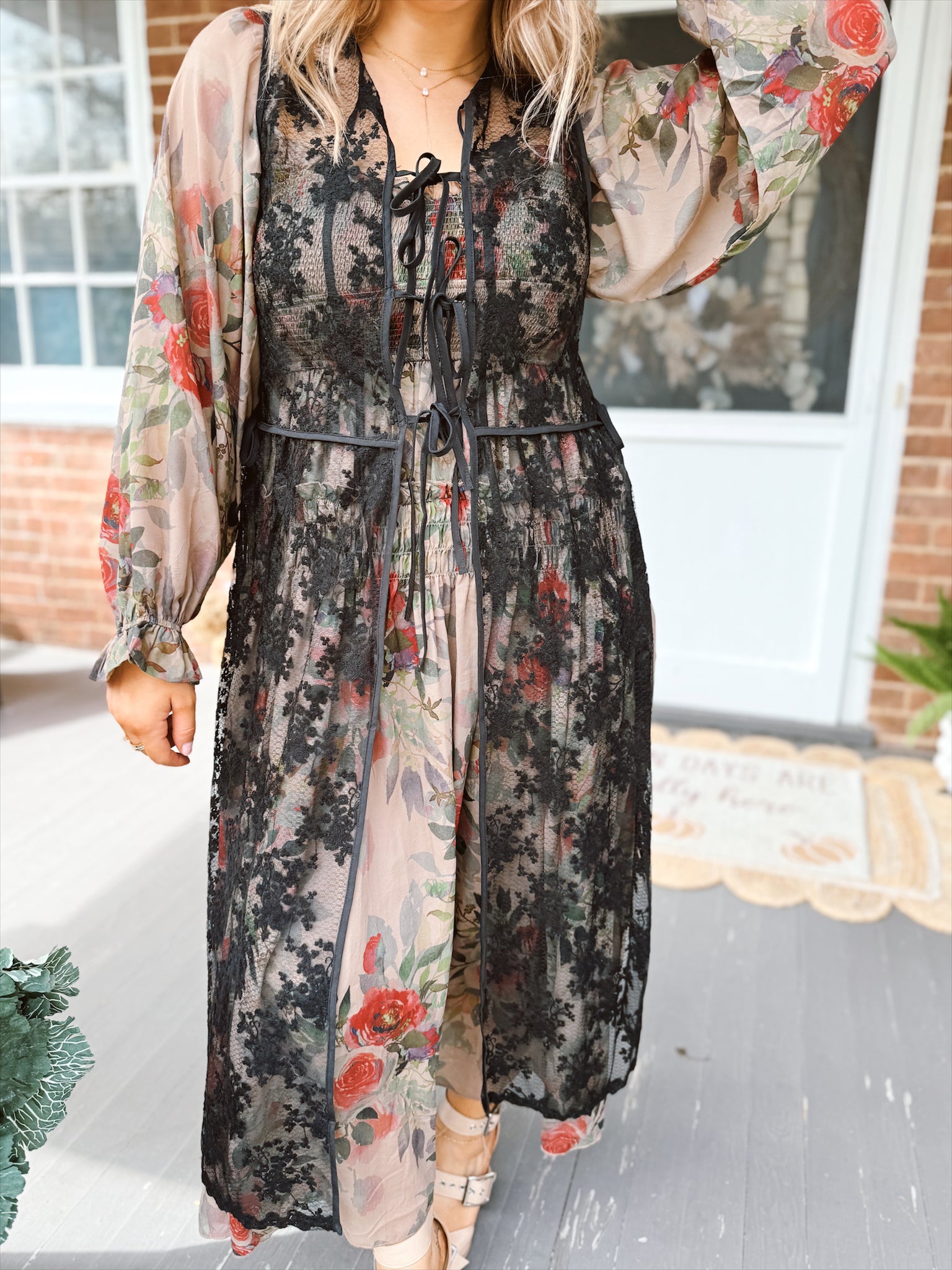Lace tie front long vest. Perfect for Summer concert and festival season! Pair over a simple tank or a graphic tea to edge up any outfit with a boho flare!