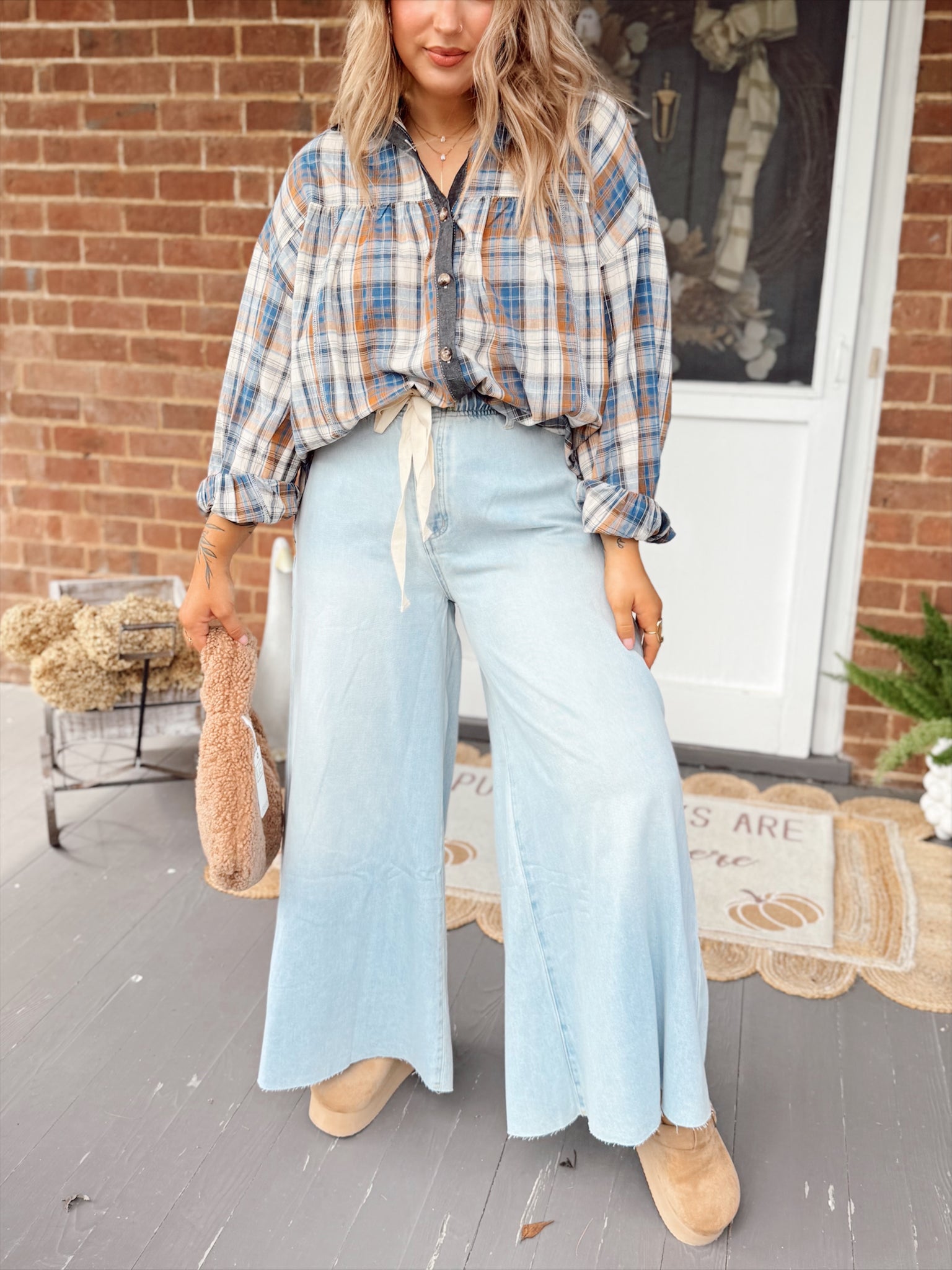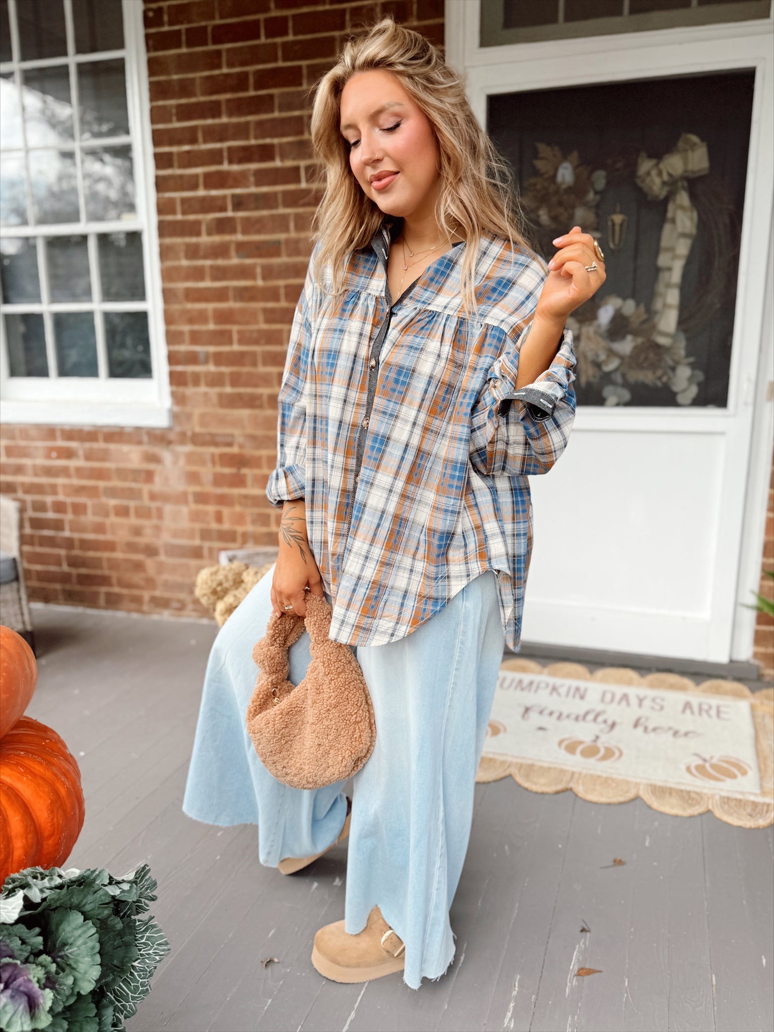 Plaid button up top with denim contrast collar and detailing. Features an oversized fit.