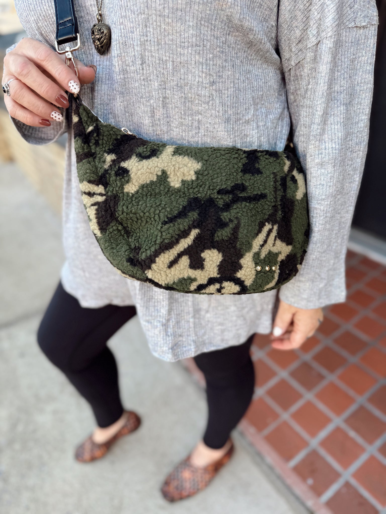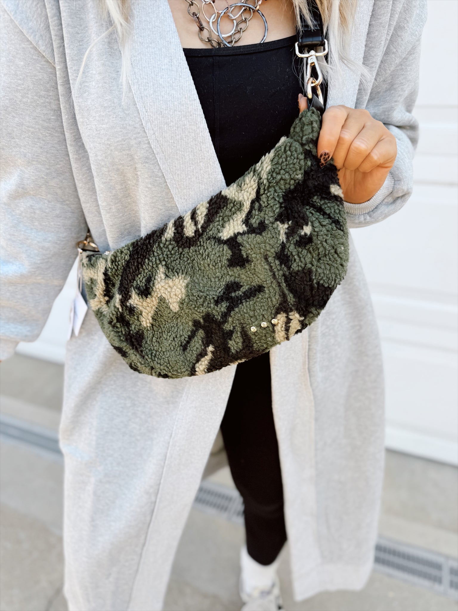 Roomy Sherpa crossbody bum bag style with a pleather back adjustable strap and gold hardware.