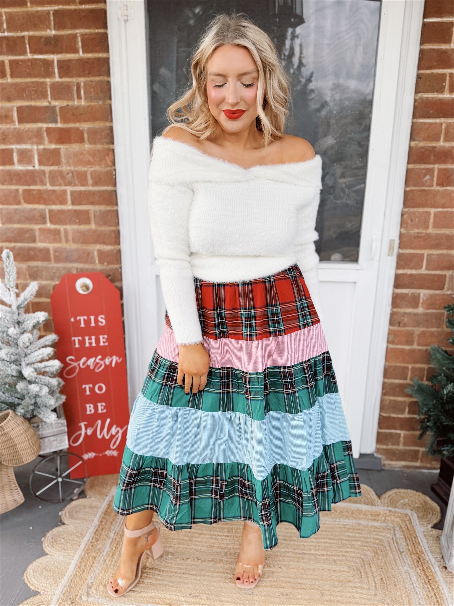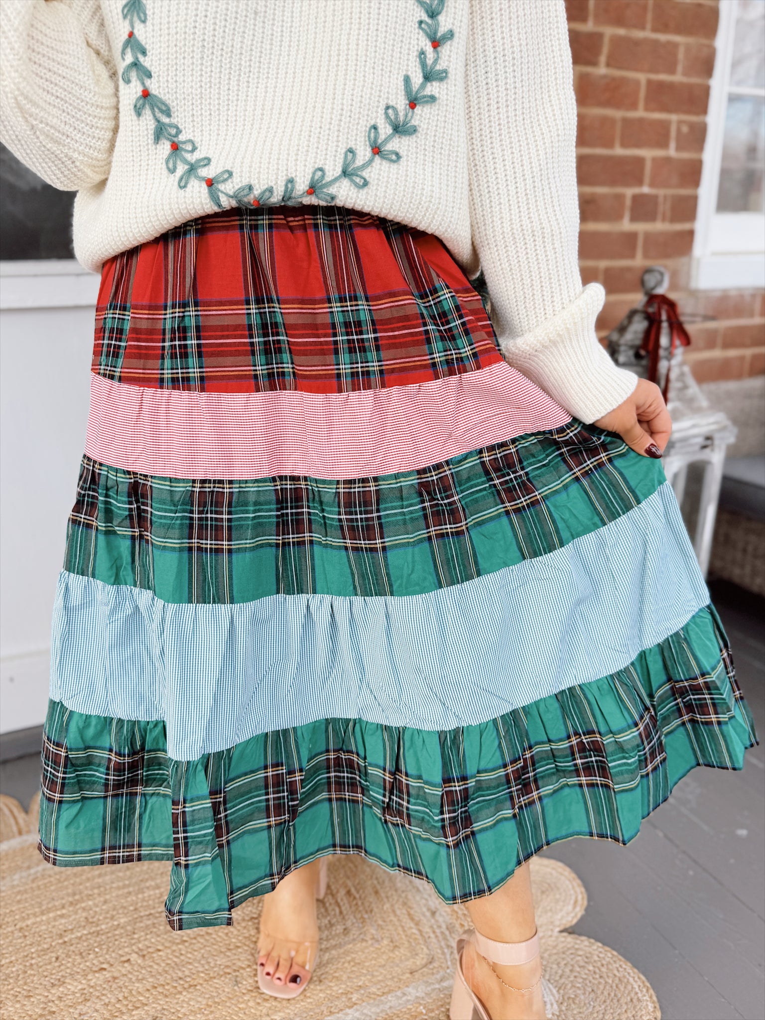 Tartan checkered and plaid mixed tired midi skirt. 100% Cotton