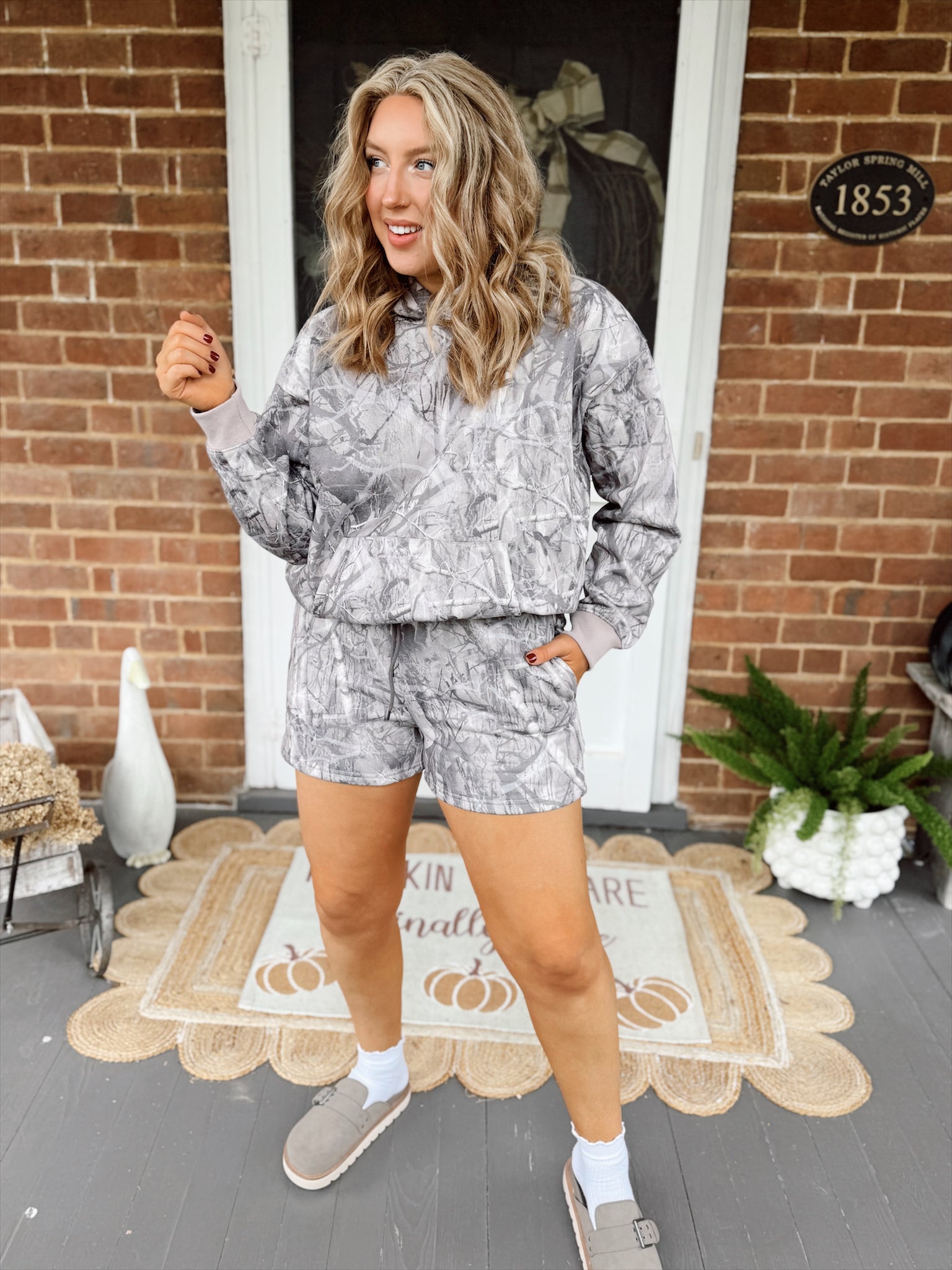 High waisted sweat shorts with front pockets, an elastic waistband, and light washed camo print.