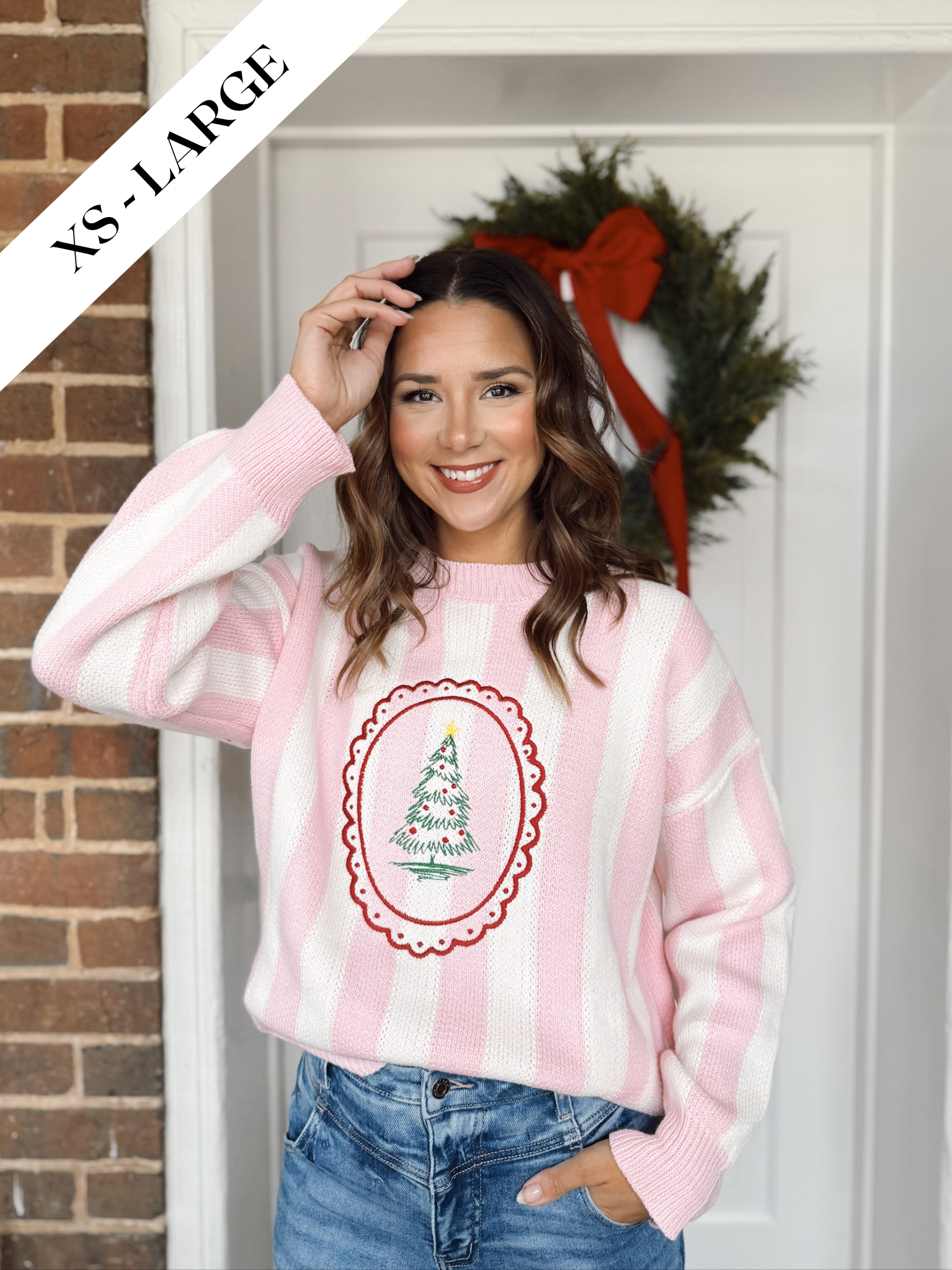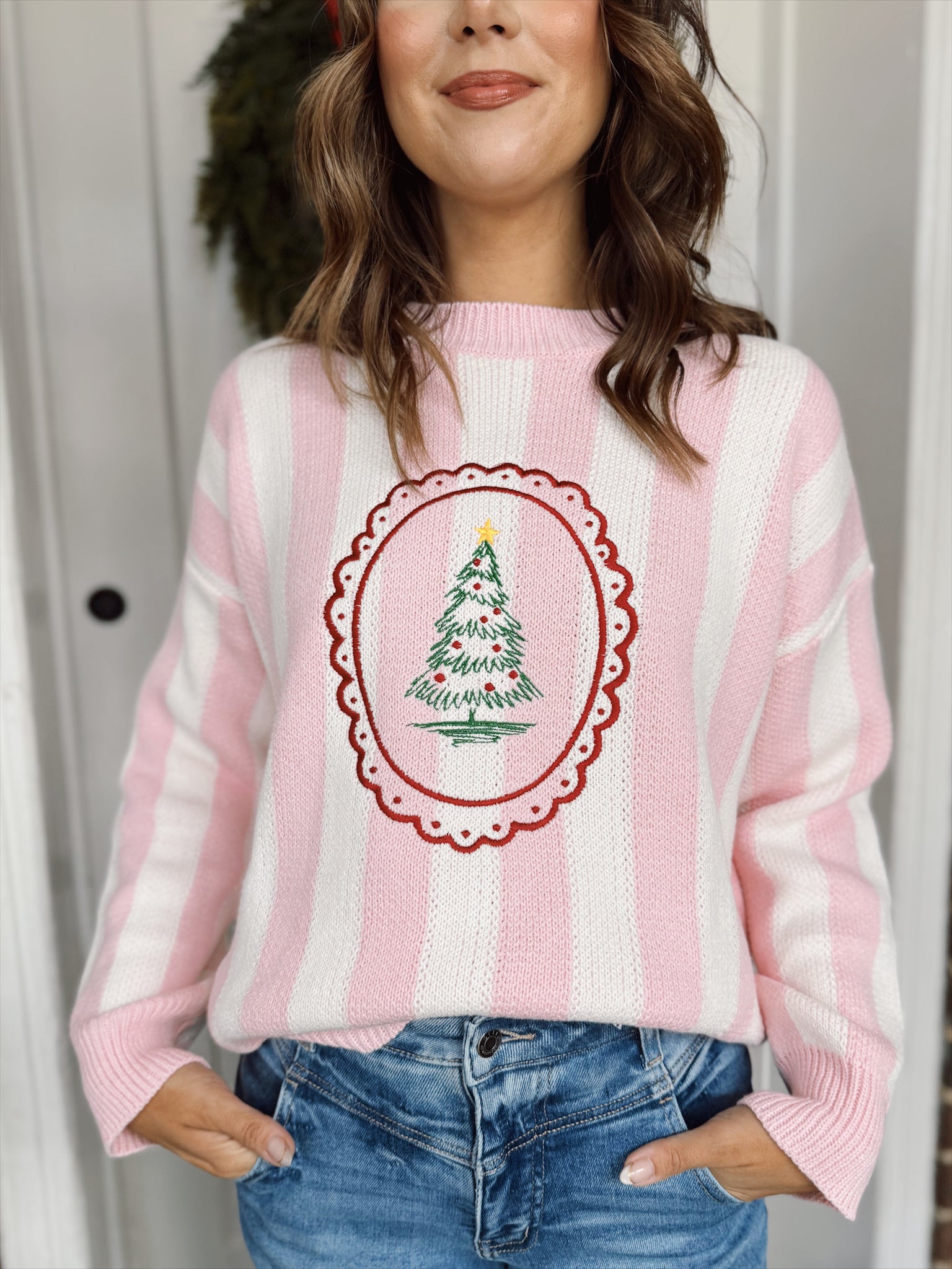 Stripe knit sweater top with tree and frame embroidery. Light pink - white stripe