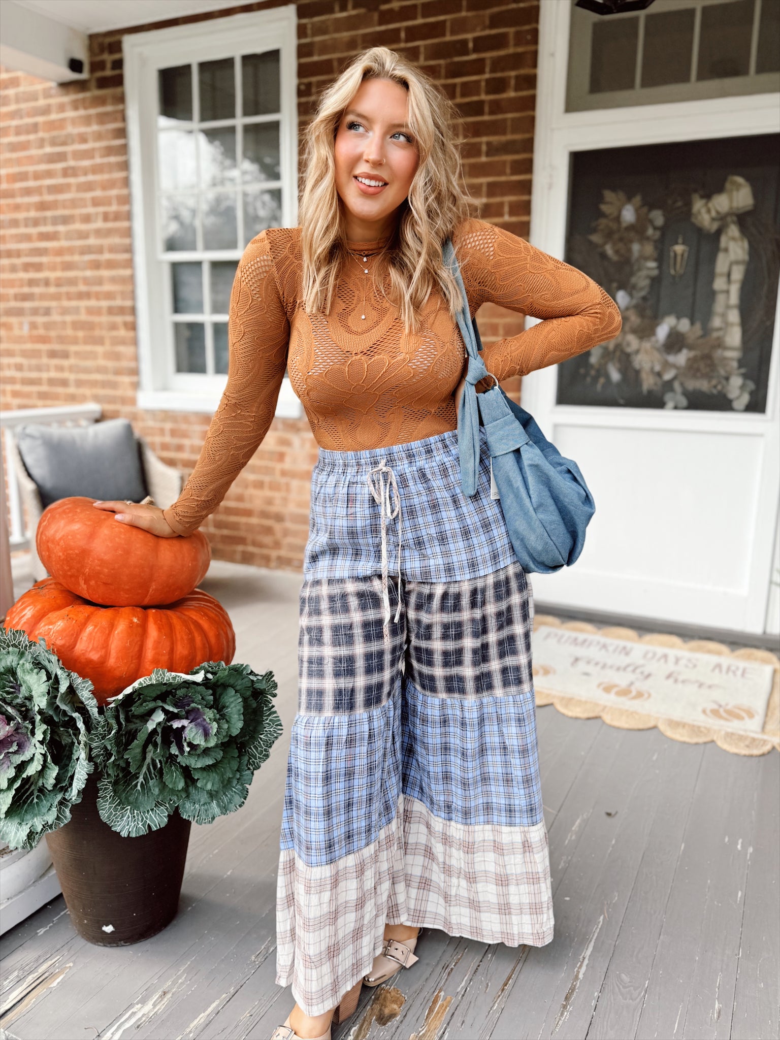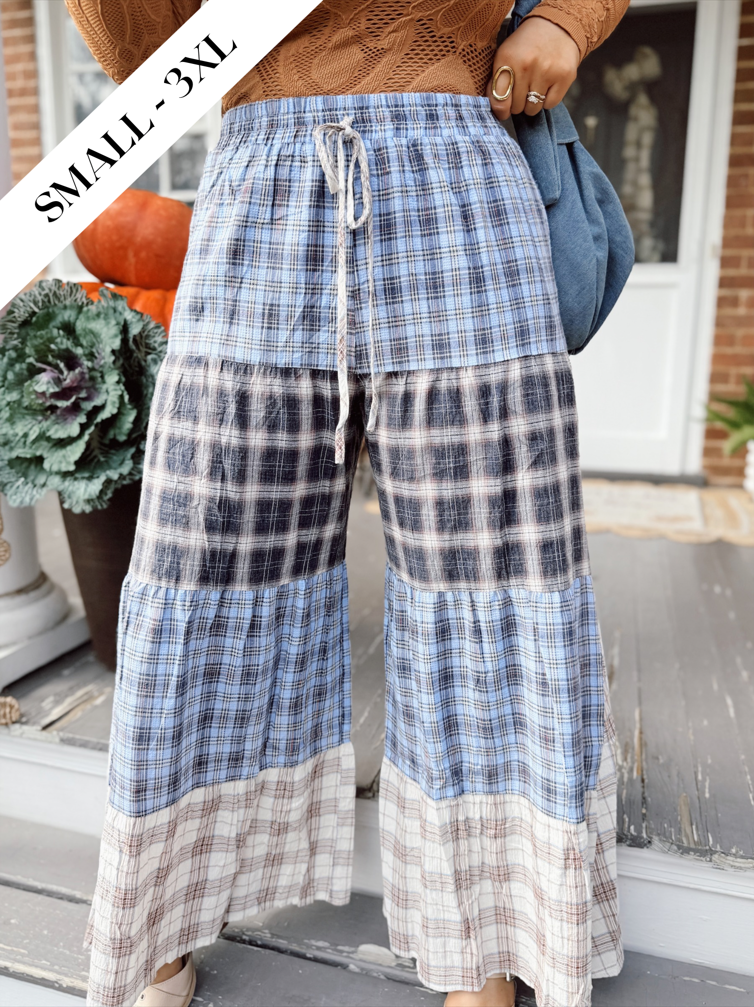 Relaxed patchwork pants featuring a mix of plaid panels and drawstring waist.