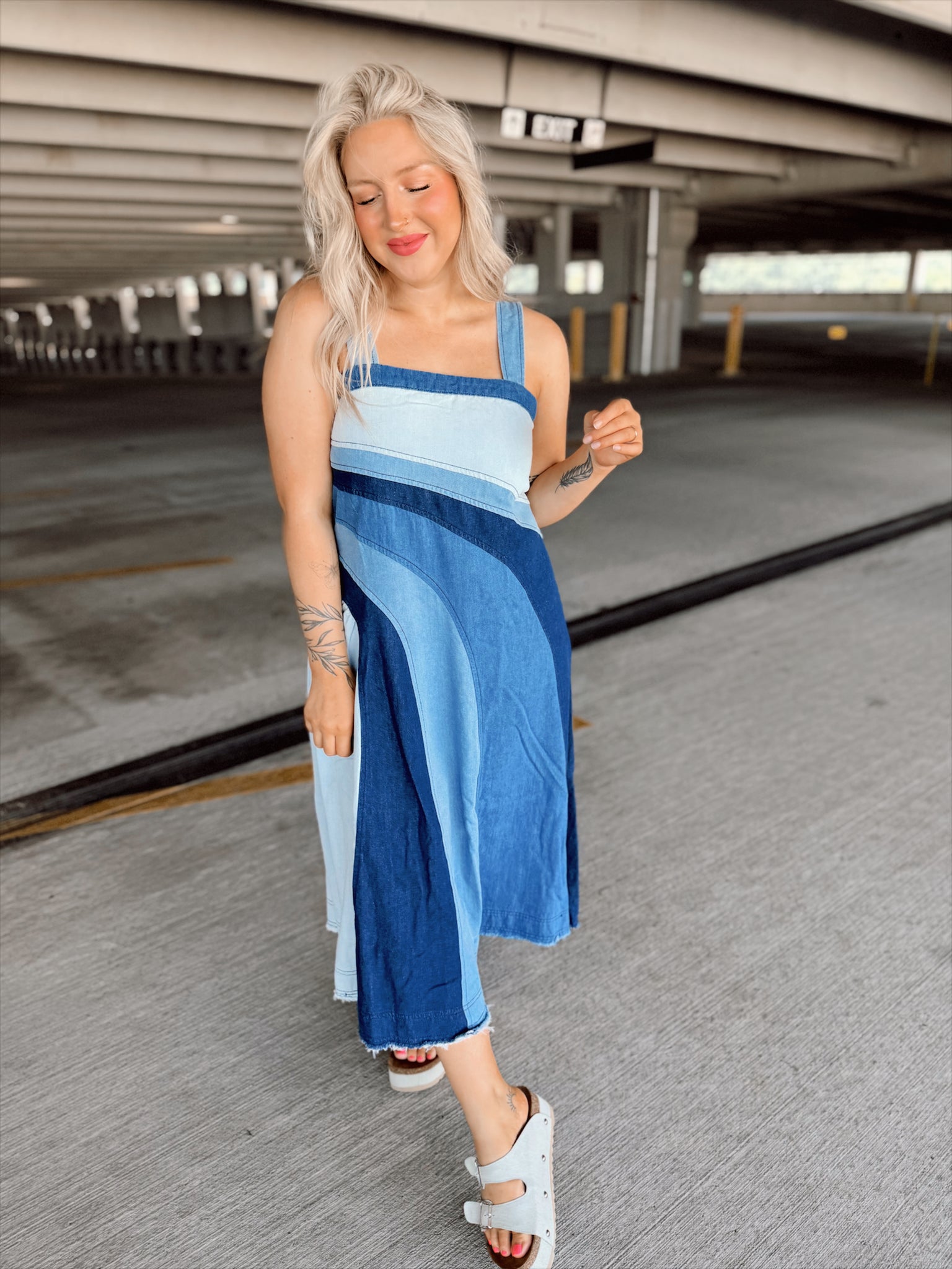 Color block denim midi dress with a comfortable straight silhouette fit and adjustable button straps.