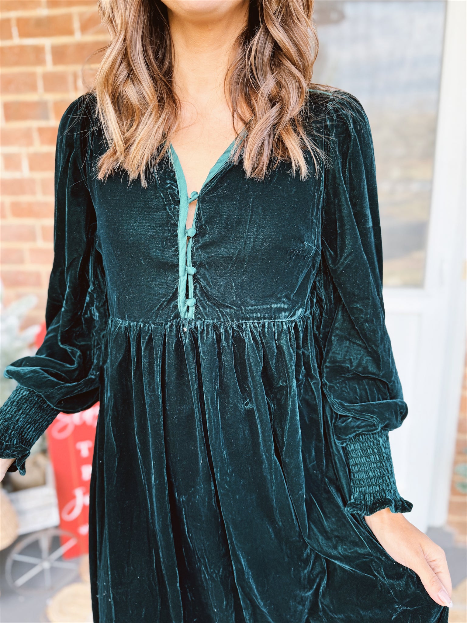 Velvet long sleeve maxi dress. Functional button bust and flowy silhouette.
