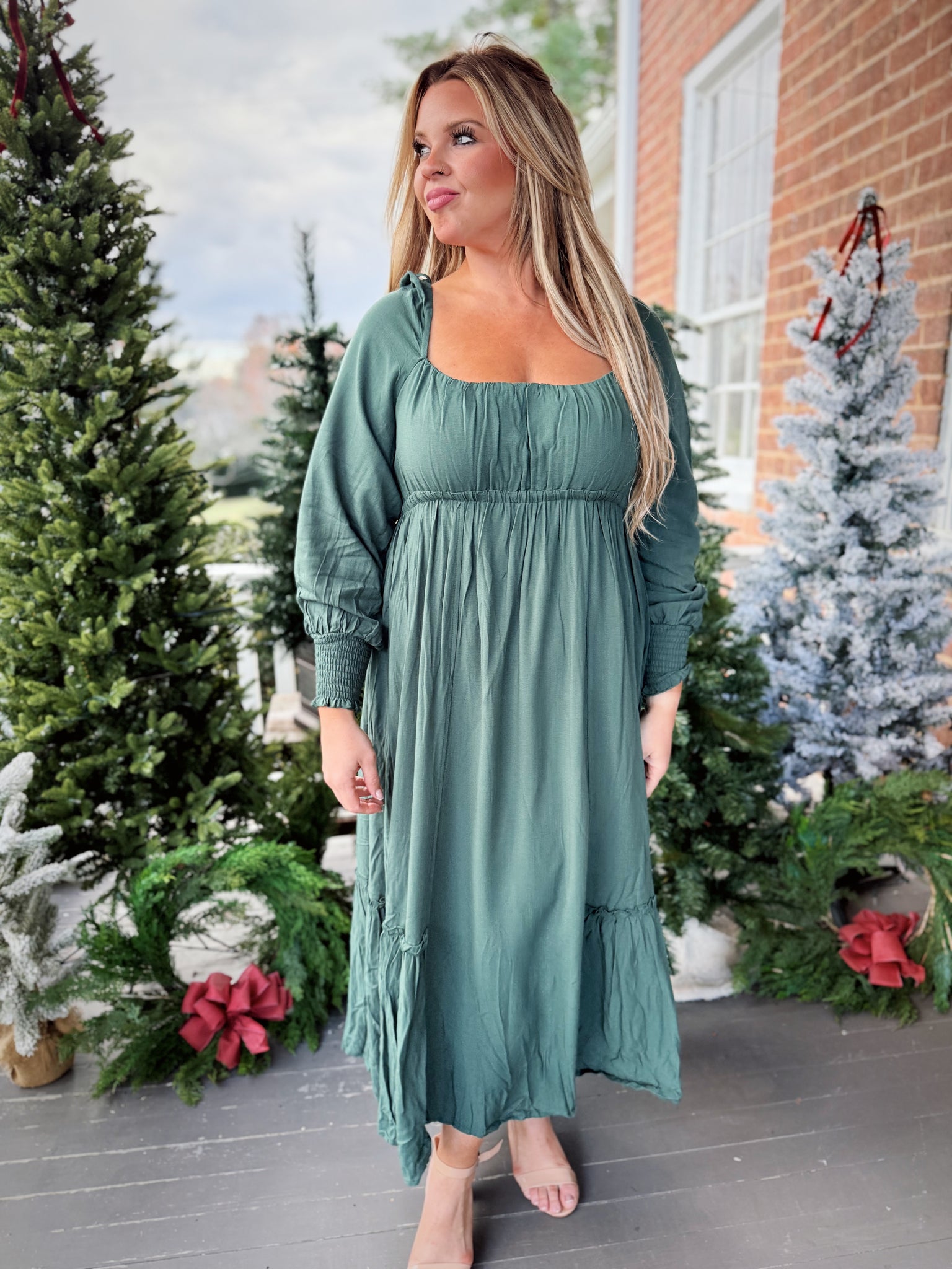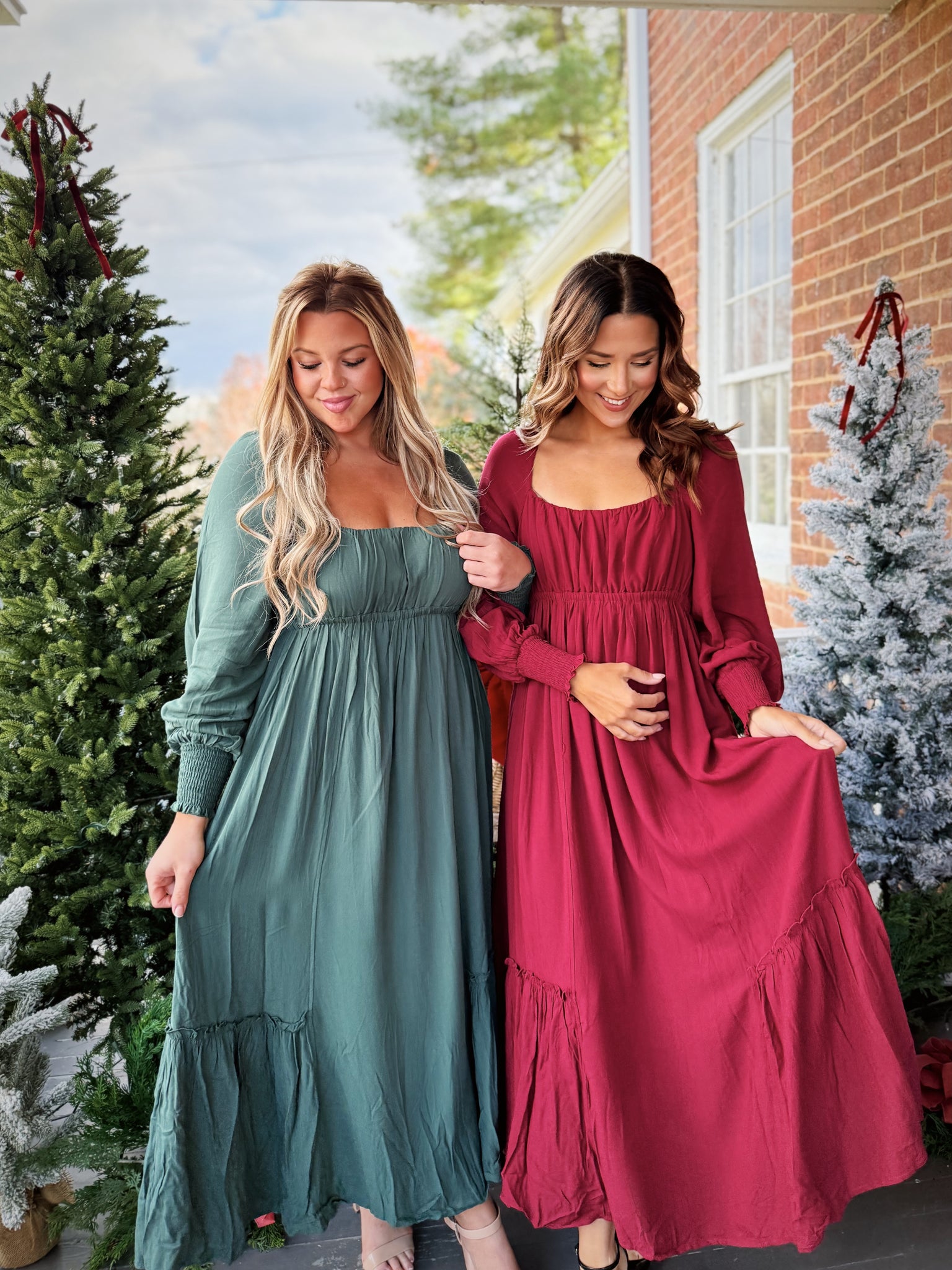 Long sleeve maxi dress featuring a gathered empire bust, self tie back keyhole, elastic waistband, smocked sleeve ends, ruffled flounce, and full lining.