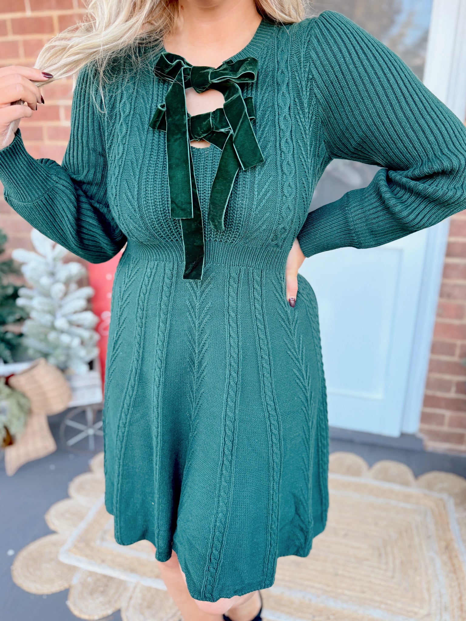 Christmas velvet bow cable sweater mini dress. Featuring long sleeves and a loose skirt fit.