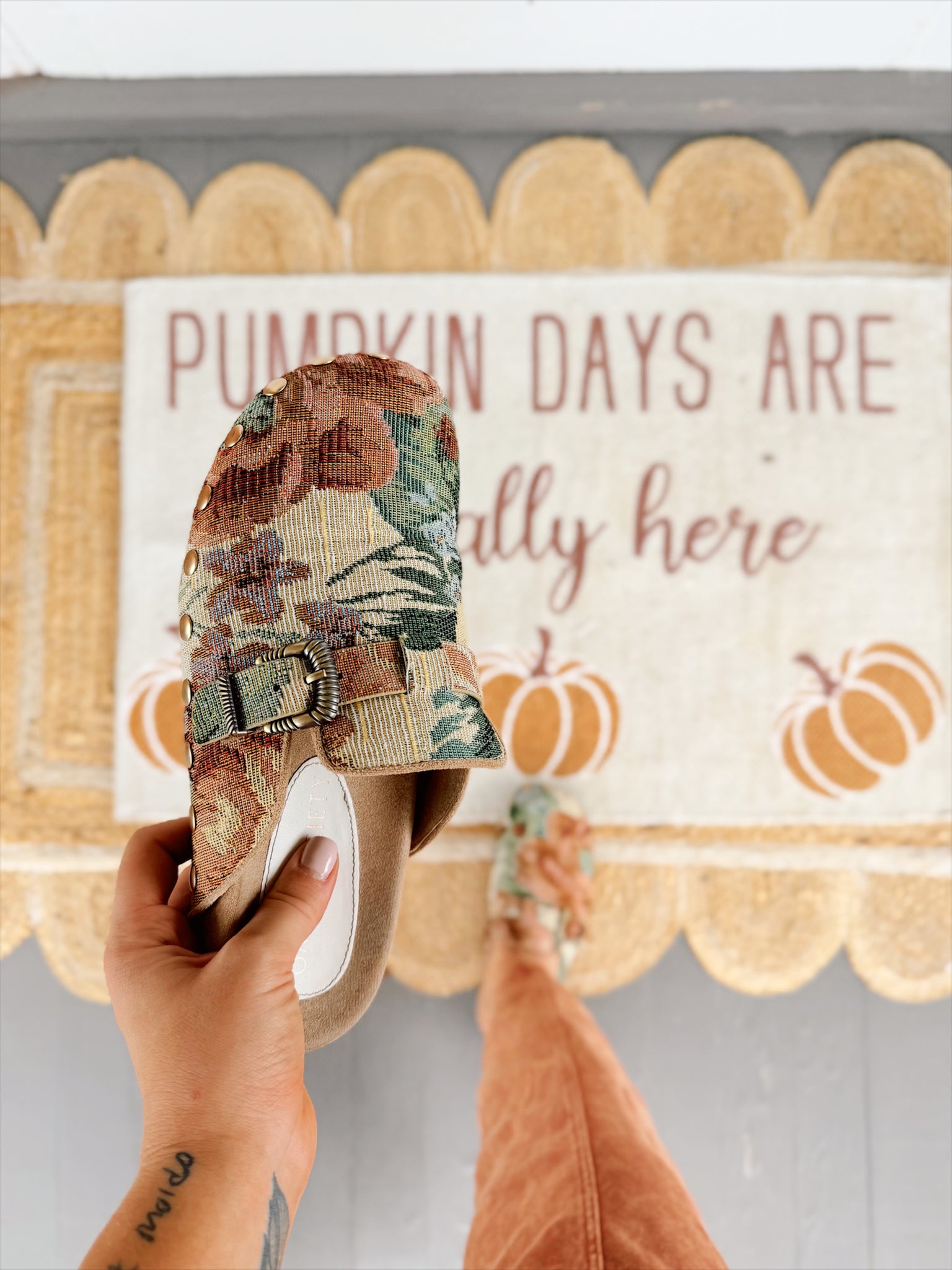 This statement shoe updates the classic clog silhouette with gold dome studs, a vintage inspired buckle, and a molded footbed that feels like a dream for all day wear. Slip on style for easy on and off with a 0.25” heel height. Run true to size.