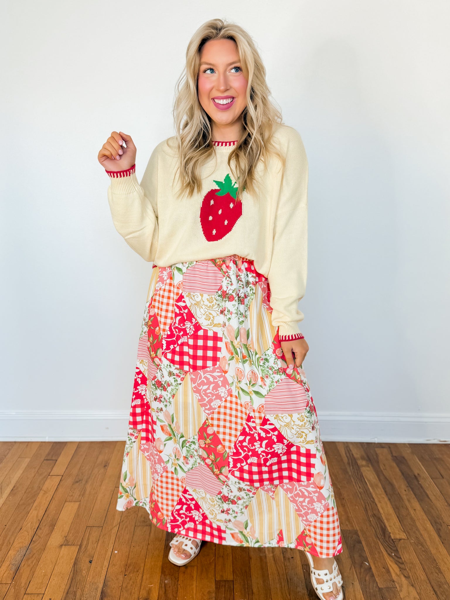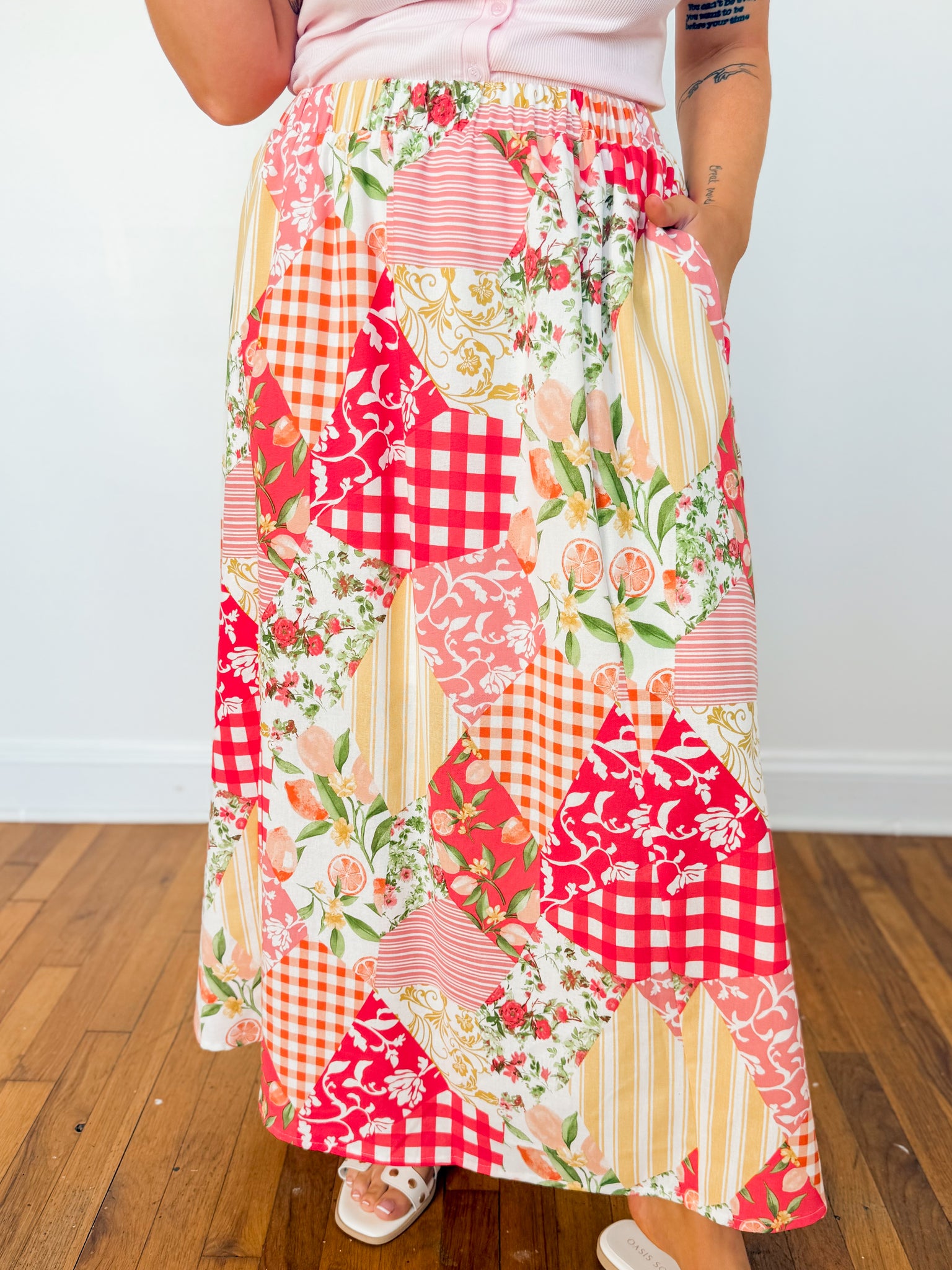 Multi patterned patch high waist maxi skirt. Red multi