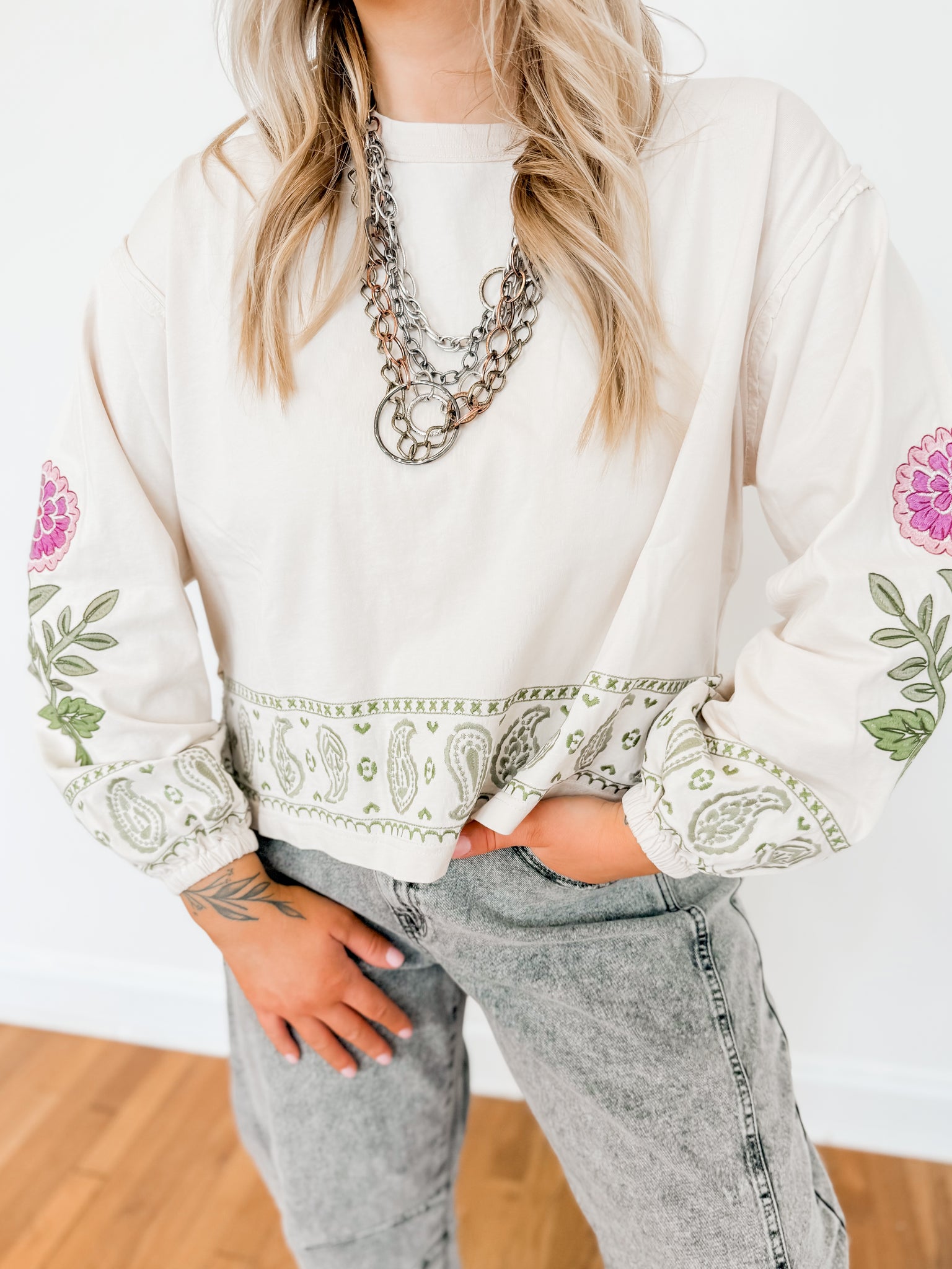 Easy, elevated, and full of charm. This embroidered cotton top features Tuscany-inspired floral motifs for a timeless, artisanal feel. Designed with raw edge seams and a relaxed silhouette, it’s garment washed for extra softness and lived-in comfort. An effortless piece that pairs perfectly with denim, trousers, or skirts.