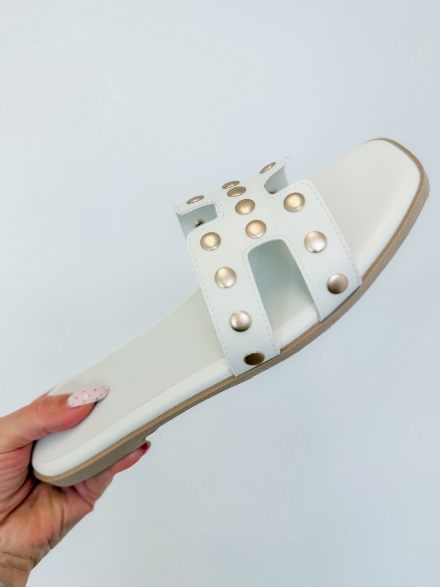 H-strap flat sandal in studded white pleather.