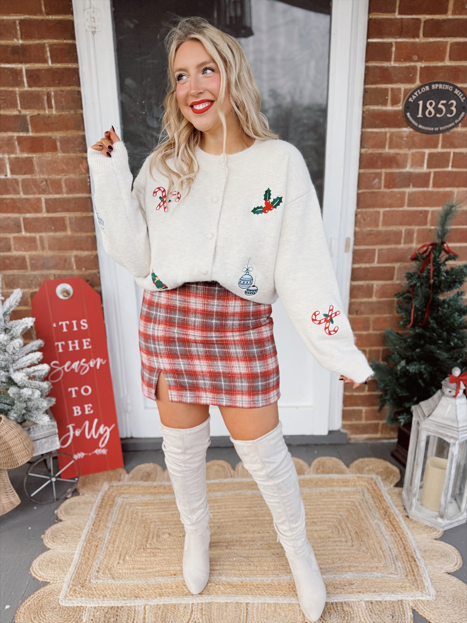Christmas holiday patchwork cardigan with covered button front. Long sleeves and full length make a great seasonal festive sweater!