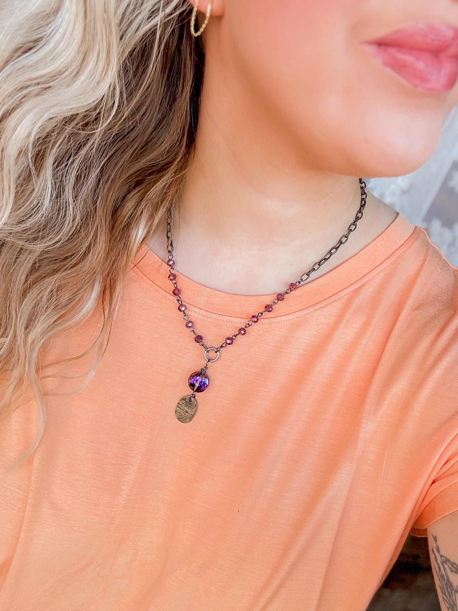 Rosaried & Coin drop pendant necklace - purple.