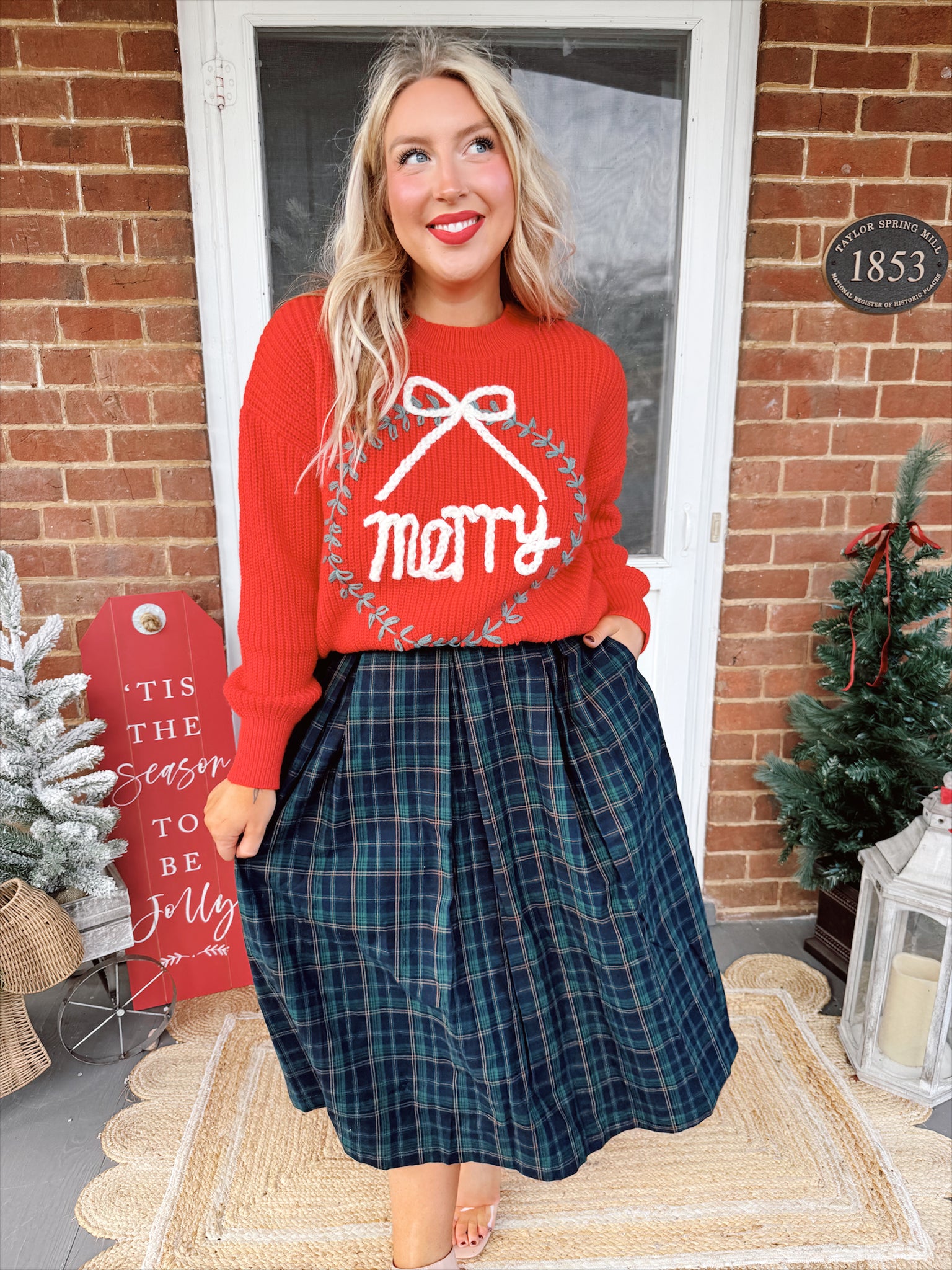 Chunky knit longsleeve sweater with embroidered crochet wreath stitching.