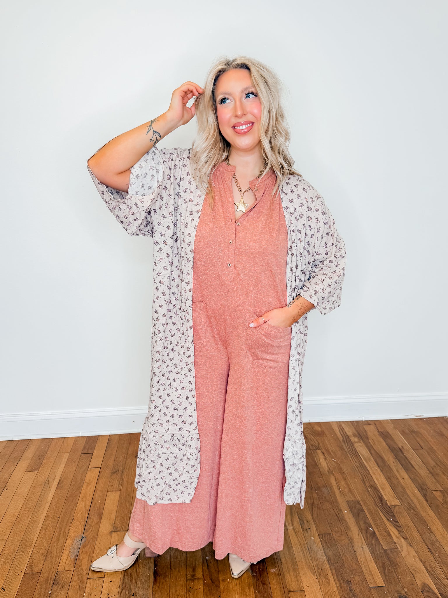 The casual heathered knit contrasts beautifully with the structured button-front design, while the ruched sleeve detailing adds dimension to the relaxed shape. The combination of softness and intentional tailoring makes this jumpsuit both cozy and polished.
