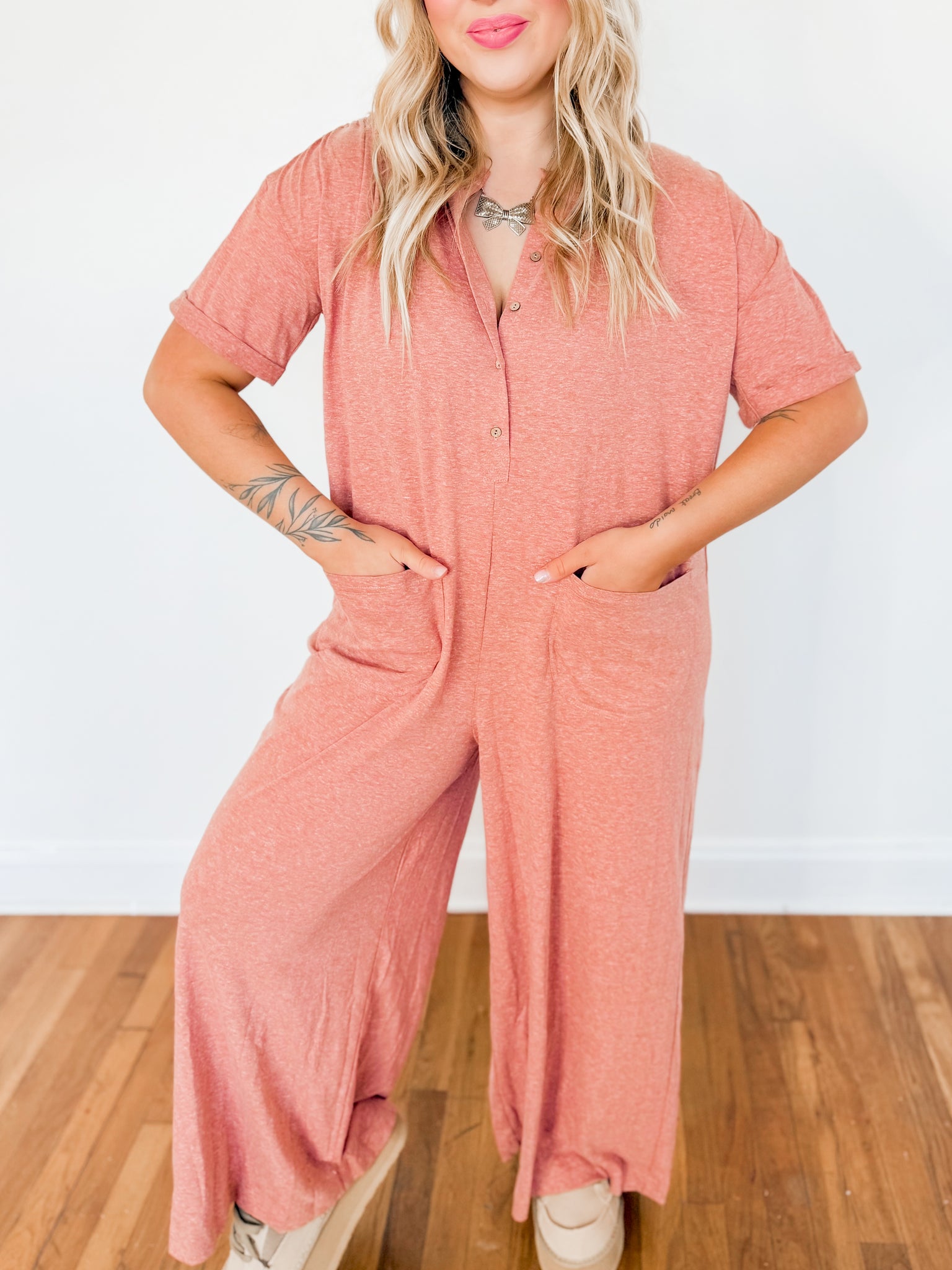 This jumpsuit features a soft heathered ginger knit fabric designed in a relaxed, oversized silhouette for all-day ease. The wide leg cut offers a flattering drape, while ruched short sleeves add subtle texture and feminine detail. Functional button front allows for adjustable styling, and side pockets bring practicality to this elevated everyday piece.