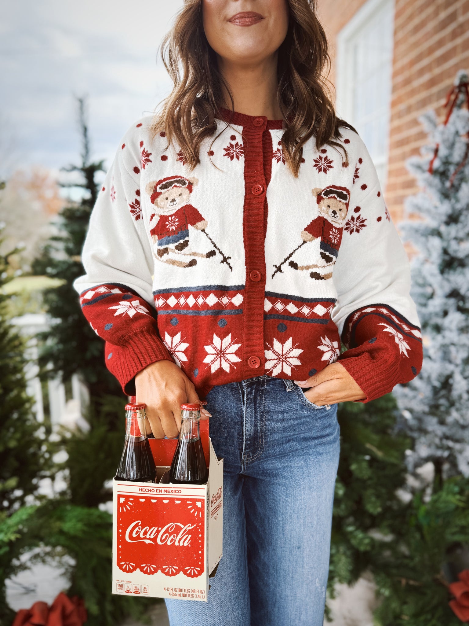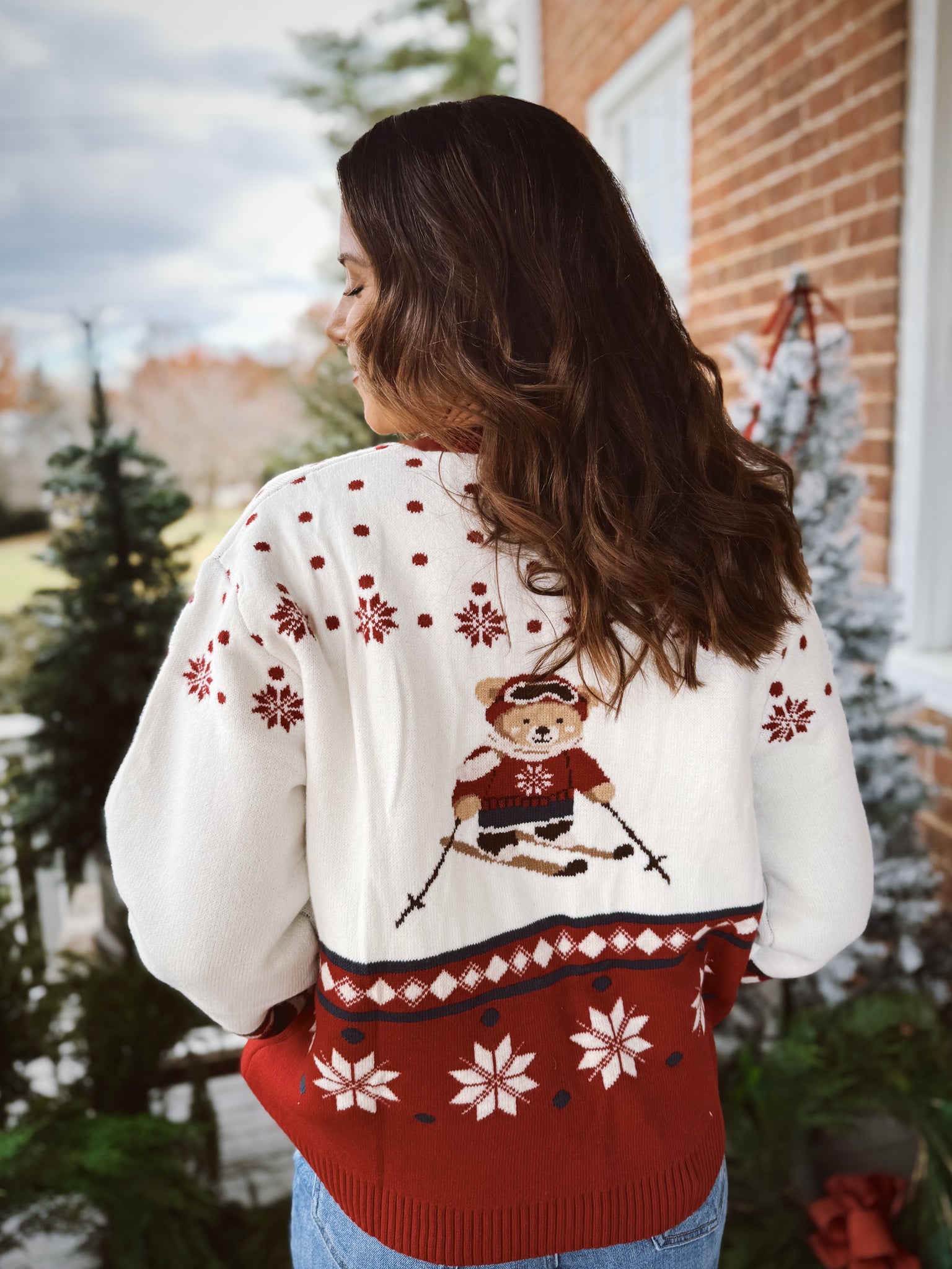 This cozy holiday sweater features a charming winter scene with skiing bears, snowflakes, and festive patterns in shades of cream, red, and navy. The button-up front and ribbed trim add a classic touch, while the playful design makes it perfect for spreading cheer all season long. A warm, nostalgic favorite for any holiday gathering.