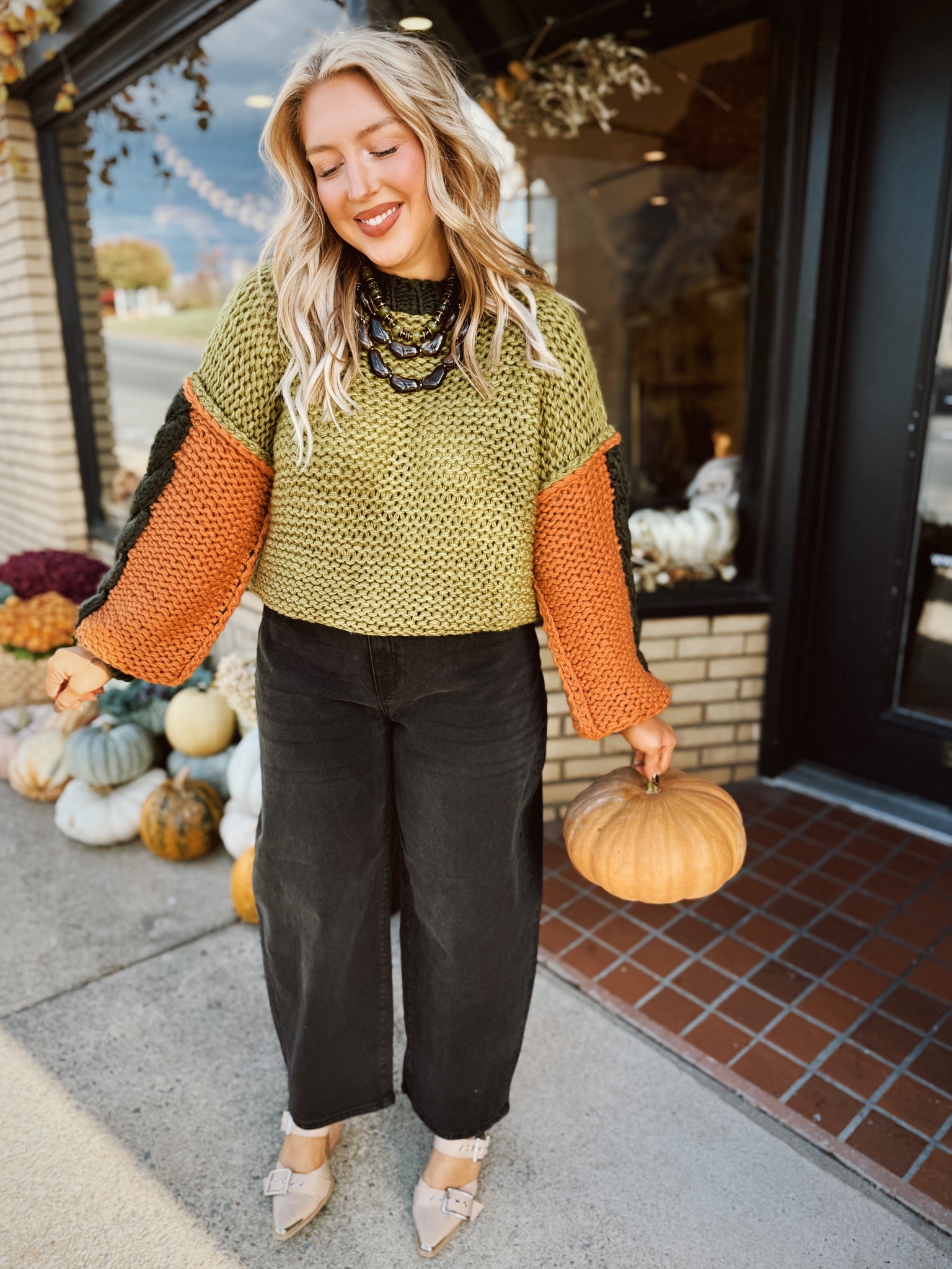 Hand crochet color block chunky knit sweater. The perfect color combo for fall! Olive/Orange/Chocolate Charcoal