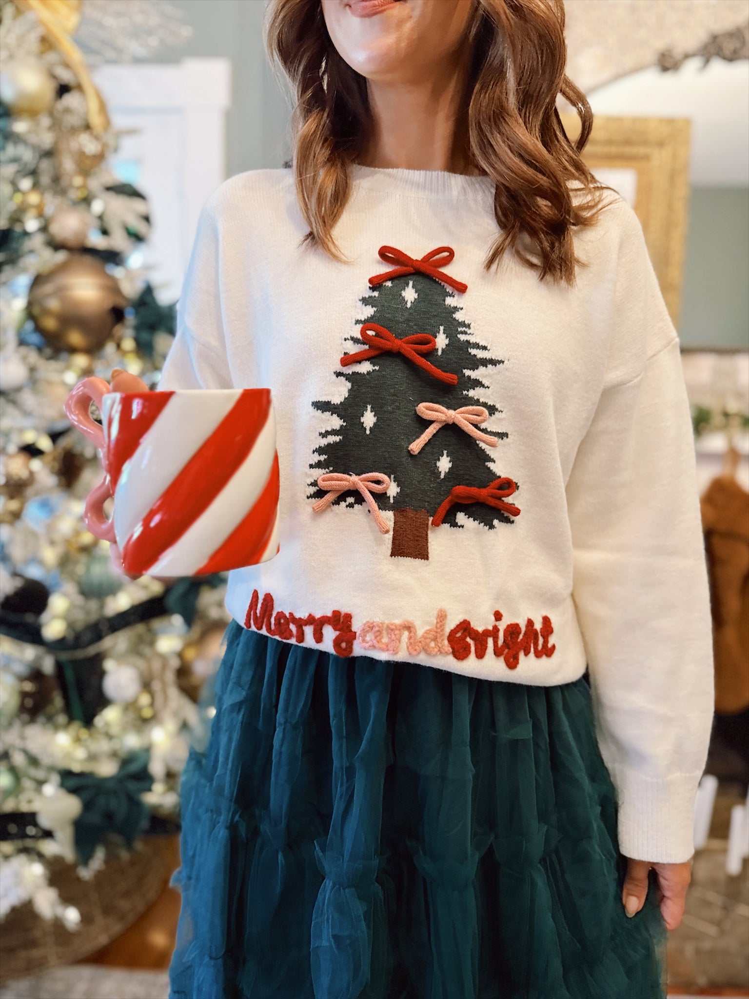 Adorable ivory long sleeve sweater with a pine Christmas tree graphic with 3D red + pink knit bows & “merry and bright” saying.