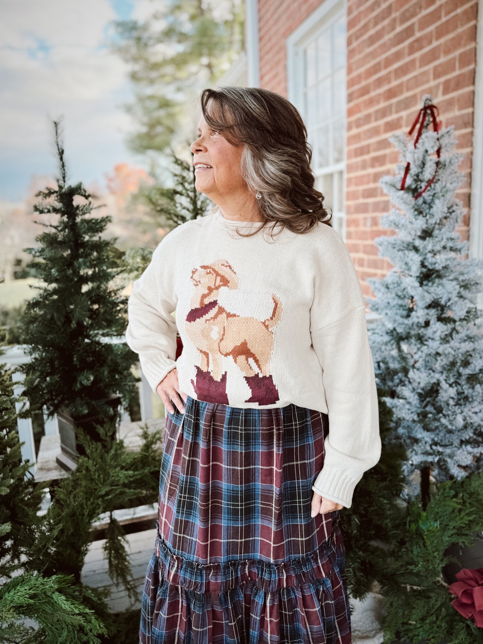 Bring a little joy to your winter wardrobe with this charming knit sweater featuring an adorable dog motif. The soft cream knit is warm and comfy without feeling heavy, and the relaxed fit makes it perfect for layering or styling tucked into your favorite skirt or jeans. Playful, heartwarming, and effortlessly festive—this is the knit that makes every cold day feel a little sweeter.