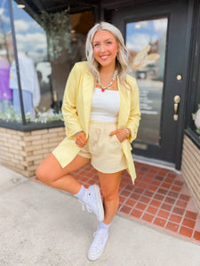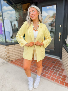 Relaxed fit full length blazer with a rolled + buttoned sleeve and collared look. This super fun yellow is perfect for spring and summer! Features front pockets.