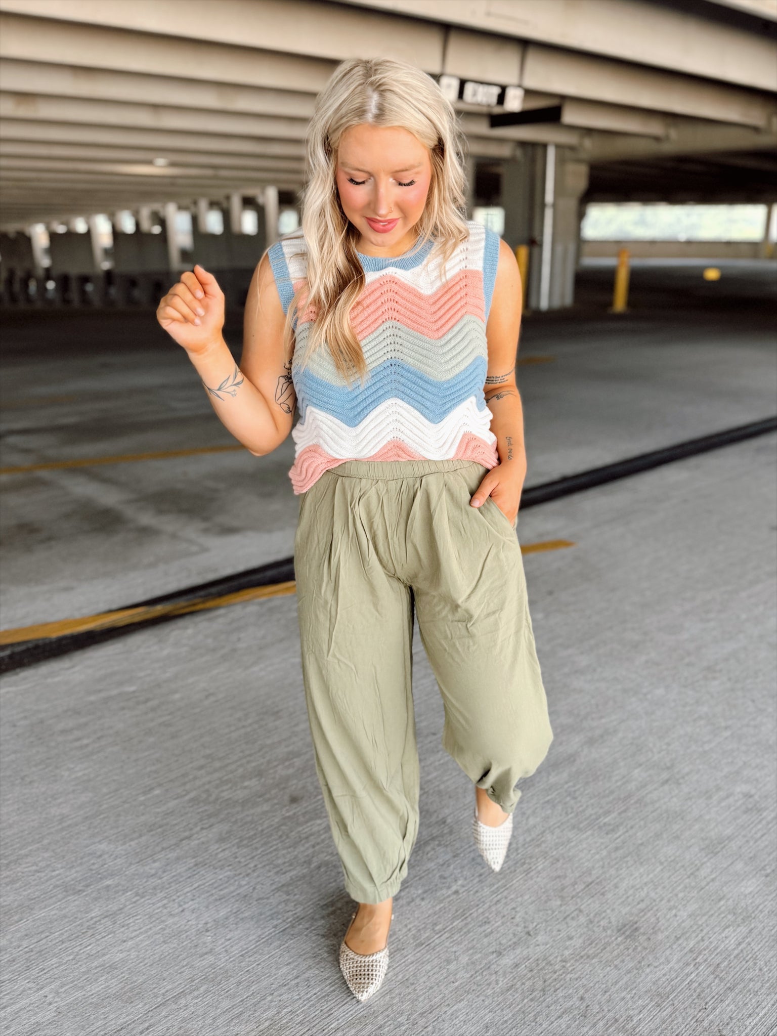 Multi color wave pointelle sweater tank. Apricot/Denim blue/Olive/Cream