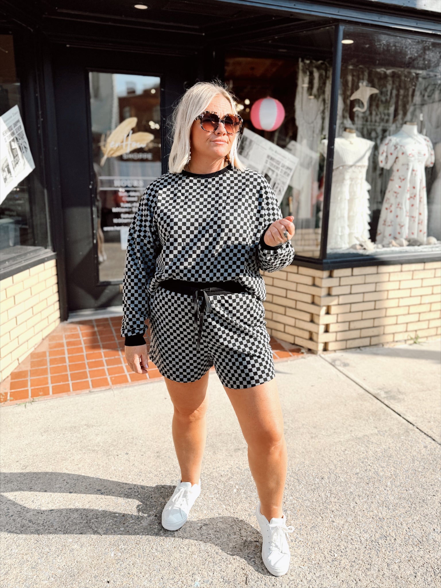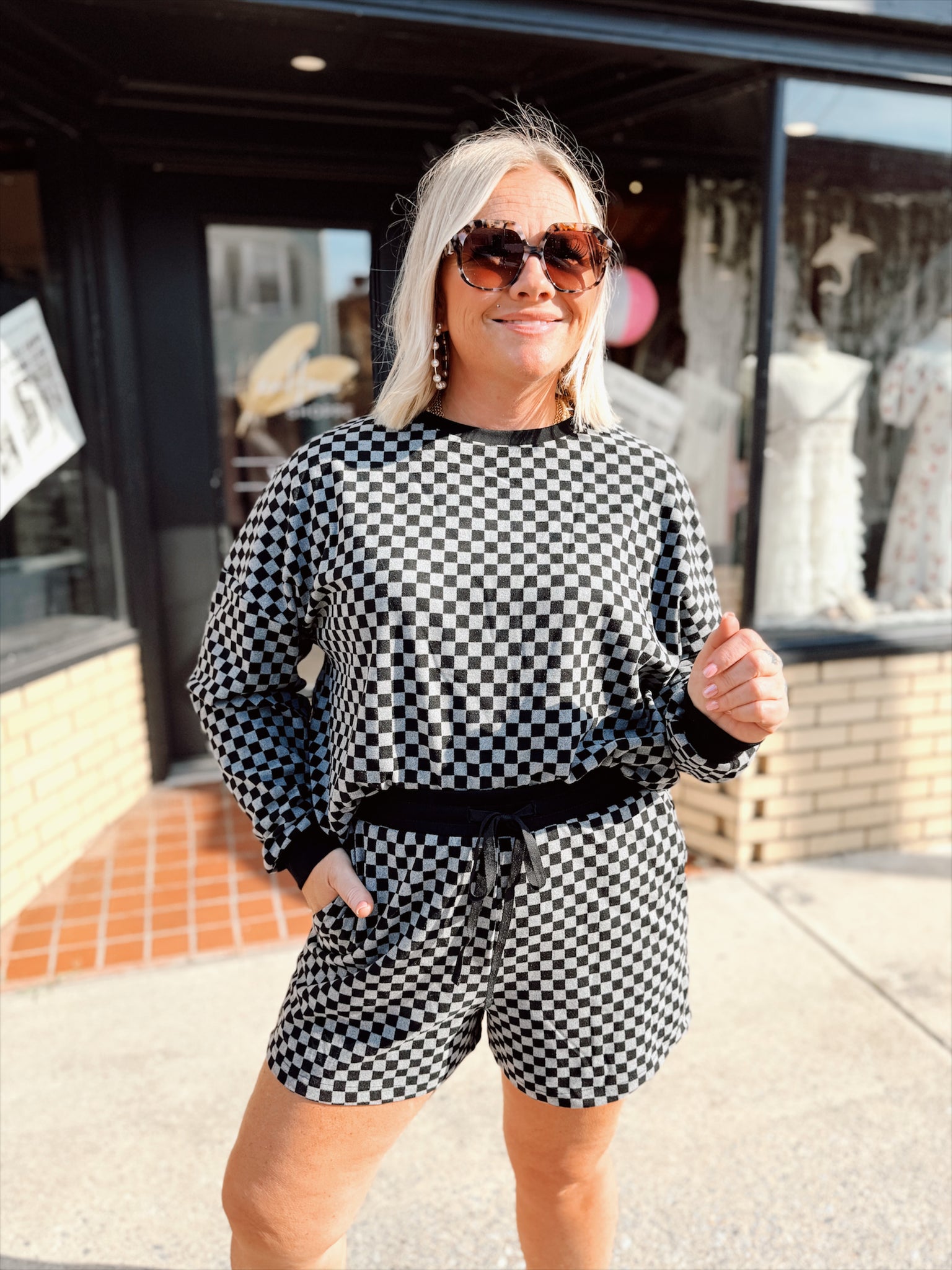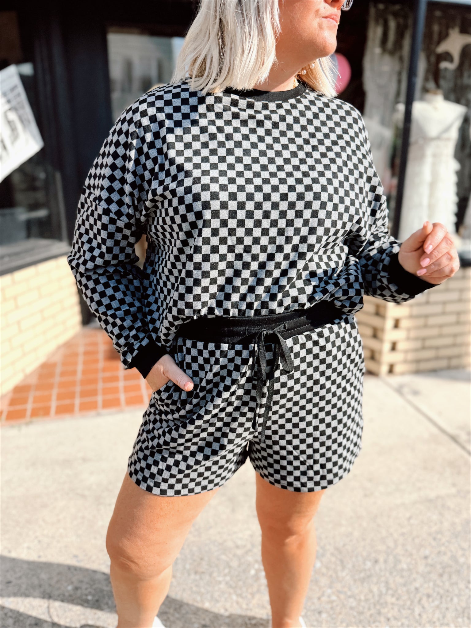 Two piece long sleeve + shorts set with pockets and a fun textured checkered pattern with a monochromatic black/gray look. The shorts feature a thick elastic + drawstring waistband for extra comfort.