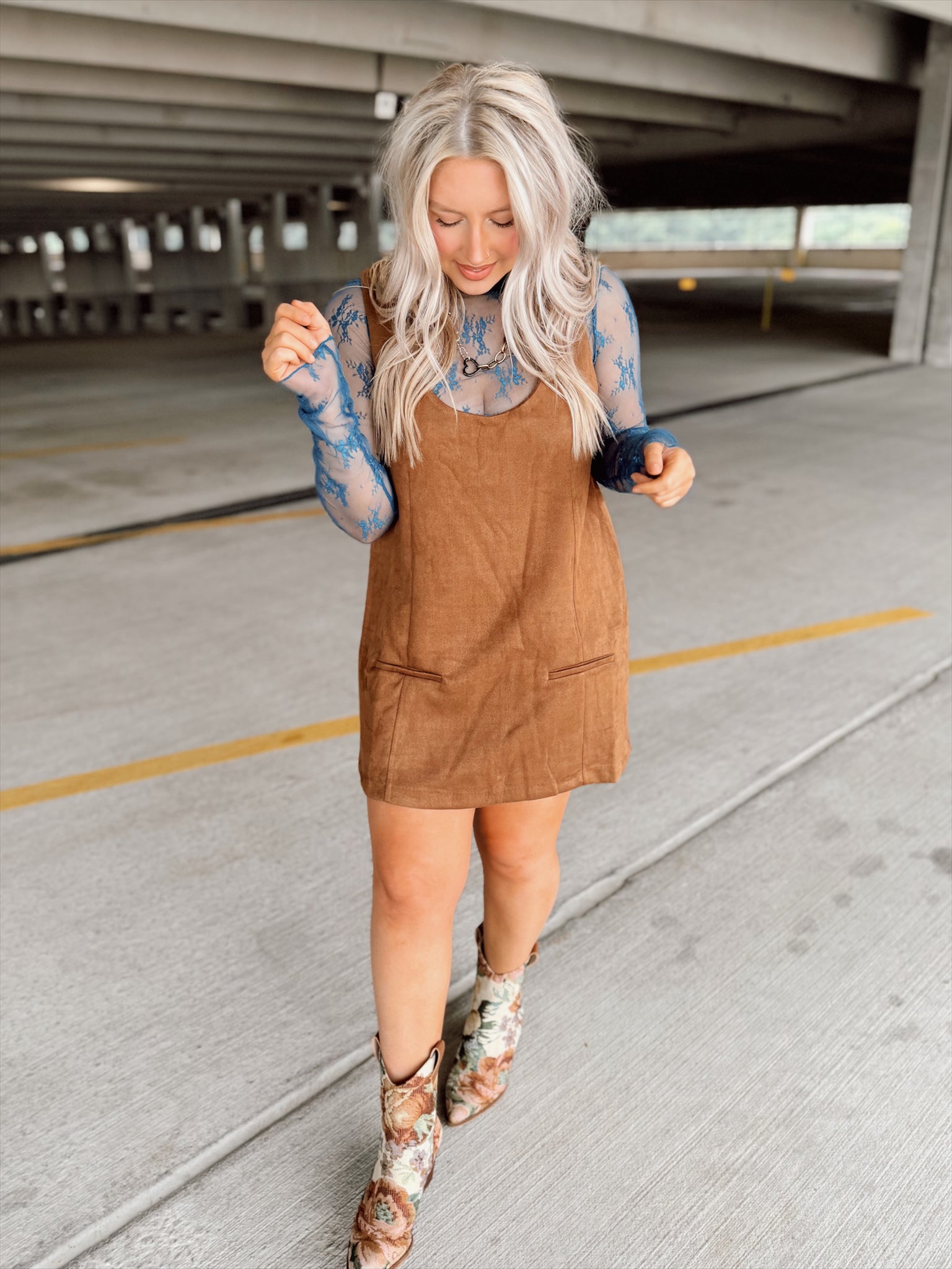 Suede material romper dress with faux pockets. Runs roomy and looks great paired with a tight lace mesh undershirt! Perfect for transitioning into fall with warm style and cool materials.