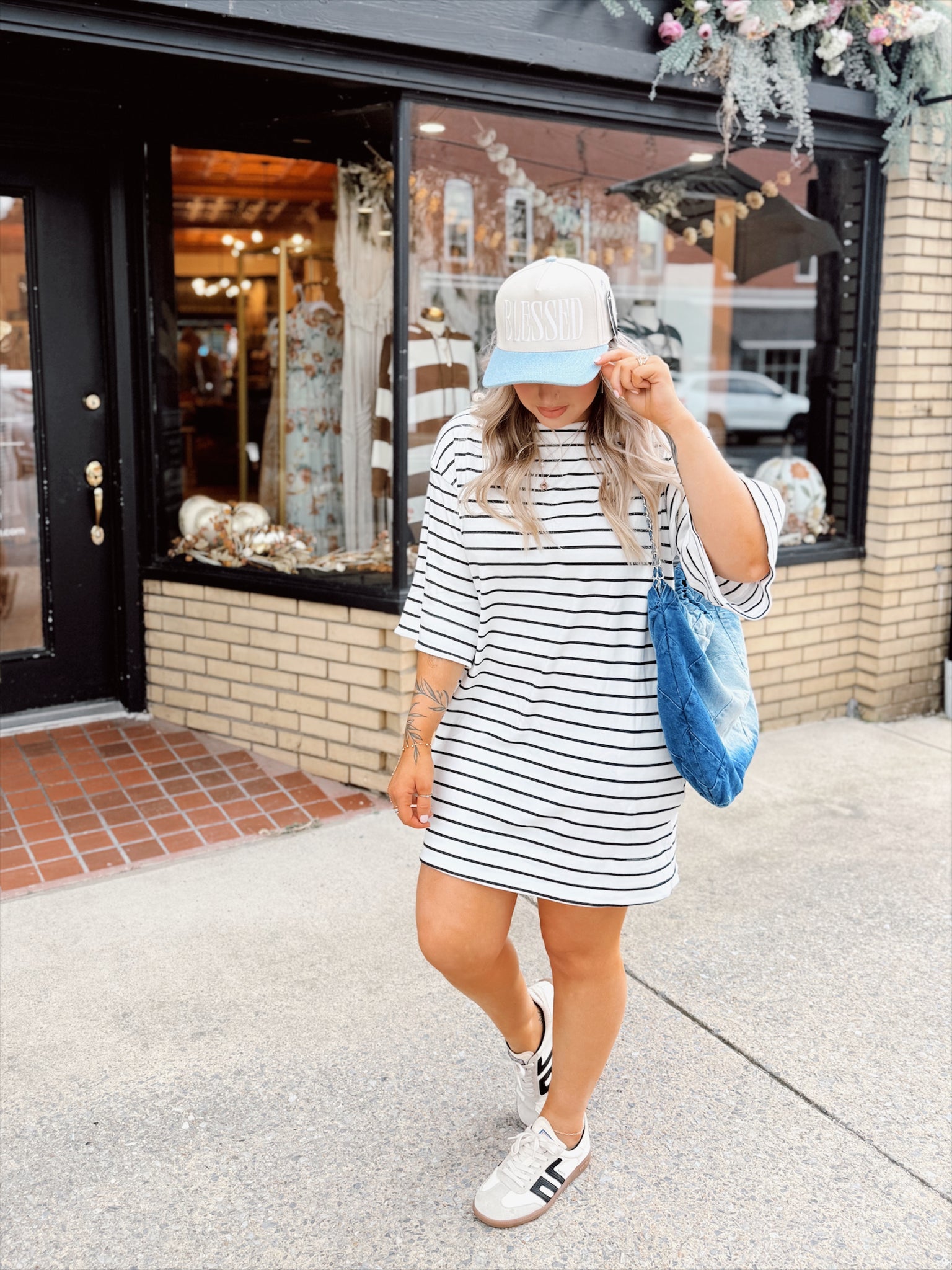 Boat neck oversized striped mini t shirt dress with side pockets and midi length short sleeves. So perfect with your favorite trucker hat and a cute pair of sneakers! Add the Maisie Denim Bag for extra cute effect.