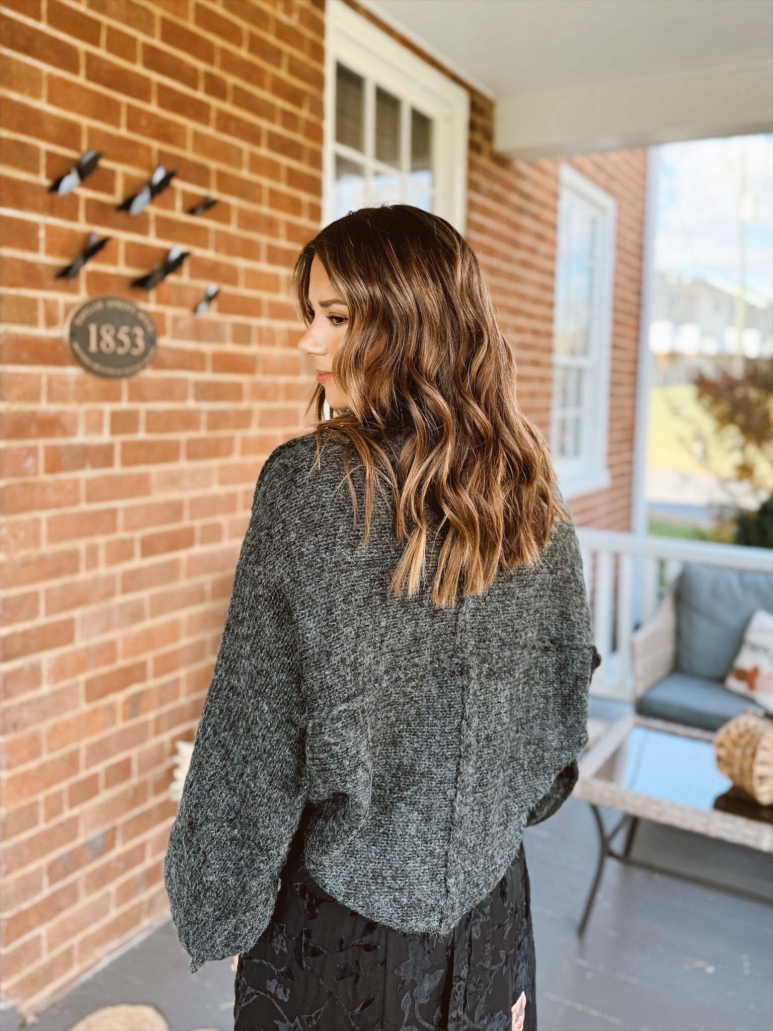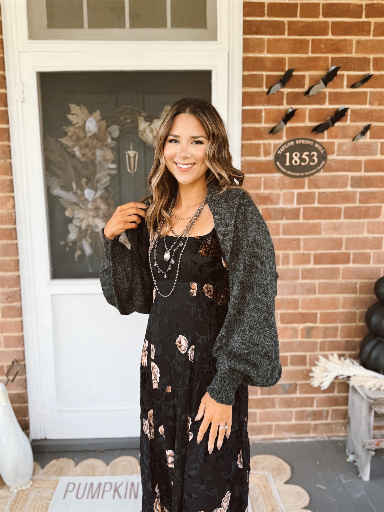 Slouchy + relaxed fitting bolero shrug. Featuring an oversized half sweater style, perfect for wearing over dresses!