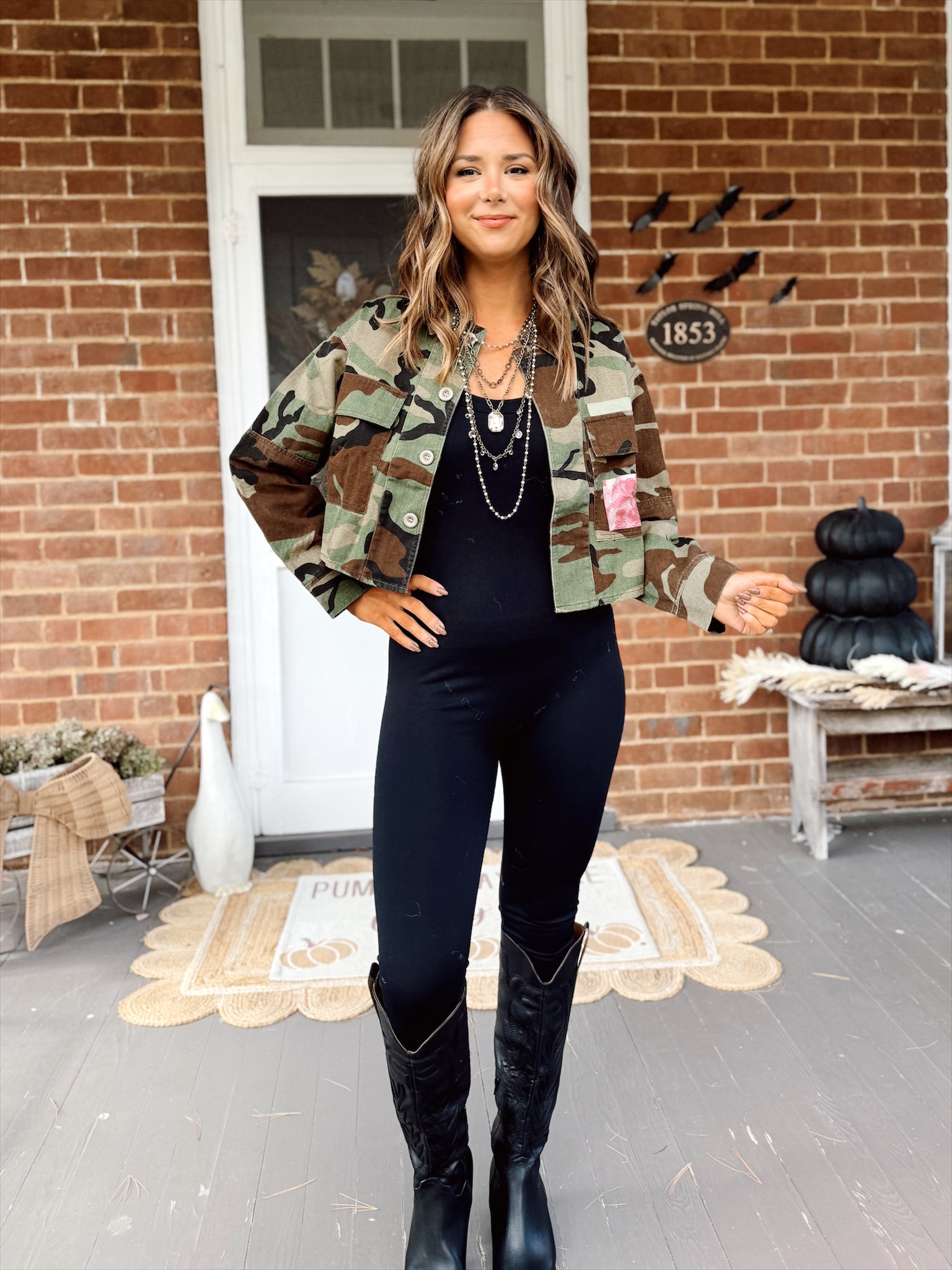 Cropped camo jacket with an edgy + bold design featuring floral patches. Great for easy layering while making a style statement!